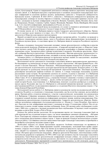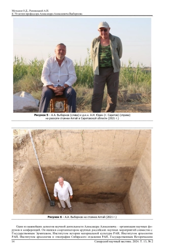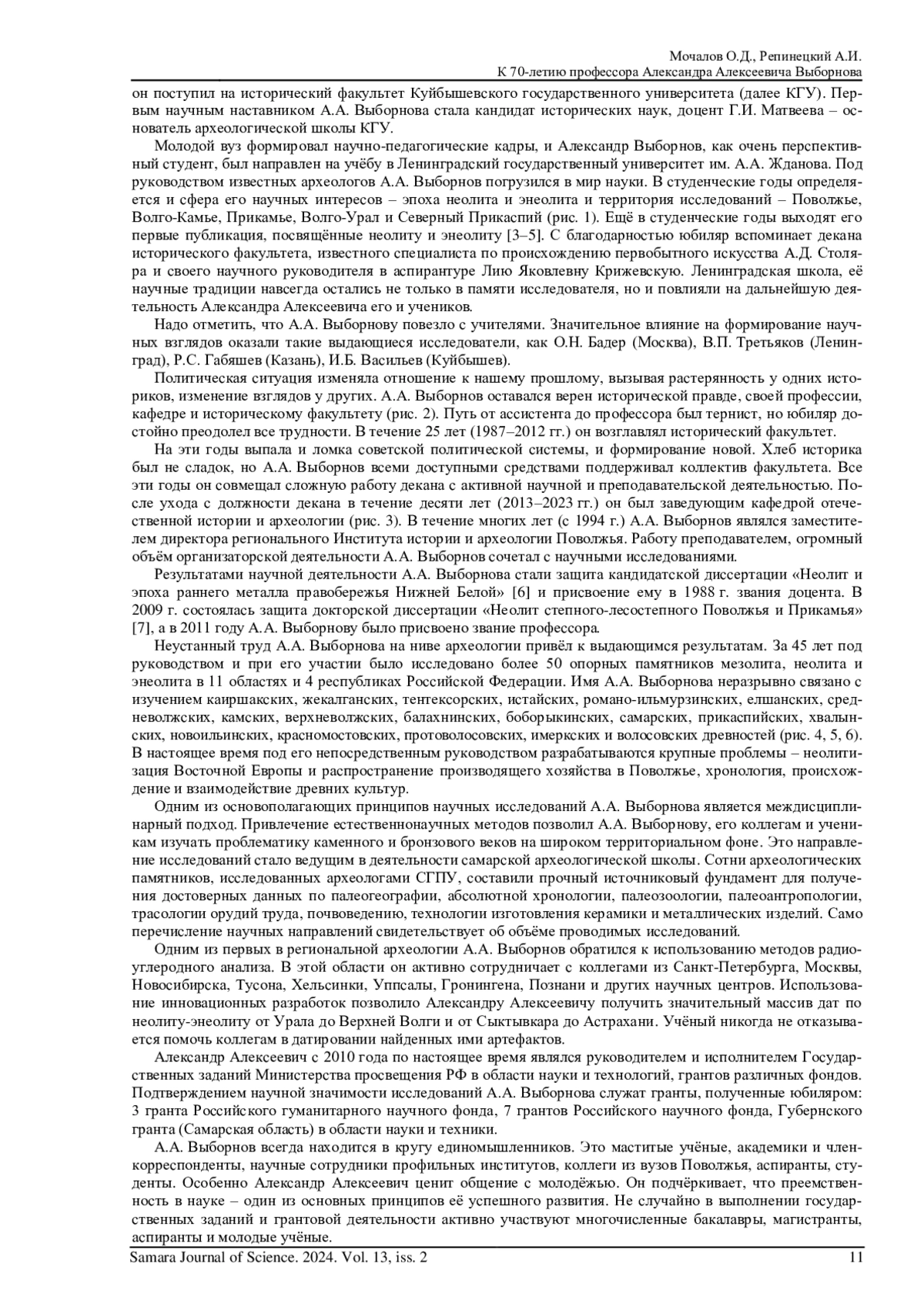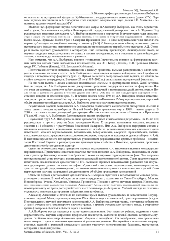 В представленной статье освещаются основные направления исследований видного археолога, доктора исторических наук, профессора Александра Алексеевича Выборнова. Определяются главные итоги полевых и камеральных работ юбиляра в первое десятилетие научной деятельности, которое было связано с изучением неолита и эпохи раннего металла нижнего течения правобережья реки Белой. Приводятся данные об исследованиях А. А. Выборнова в Сурско-Мокшанском междуречье и полученных в ходе них результатах. Освещаются ключевые достижения работ на территории Северного Прикаспия и их значение. Отмечается важная роль Александра Алексеевича в получении большого массива радиоуглеродных дат для памятников эпохи камня Волго-Камья и сопредельных регионов. Констатируется высокая научная значимость совместных многолетних исследований юбиляра с И. Н. Васильевой, в ходе которых были объединены и сопоставлены данные изучения археологической керамика на основе типологического и историко-культурного подходов и радиоуглеродного анализа. Представляются и анализируются основные сведения о работах последних десятилетий А. А. Выборнова на территории Саратовской, Астраханской, Самарской областей, Республики Марий Эл. Помимо научных исследований важным направлением деятельности А. А. Выборнова является подготовка учеников, за годы работы под его руководством защитили кандидатские диссертации: А. В. Вискалин, А. И. Королев, В. В. Ставицкий, А. М. Комаров, Е. В. Козин, А. А. Шалапинин, С. А. Кондратьев, Л. А. Вязов, К. М. Андреев, А. В. Барацков.