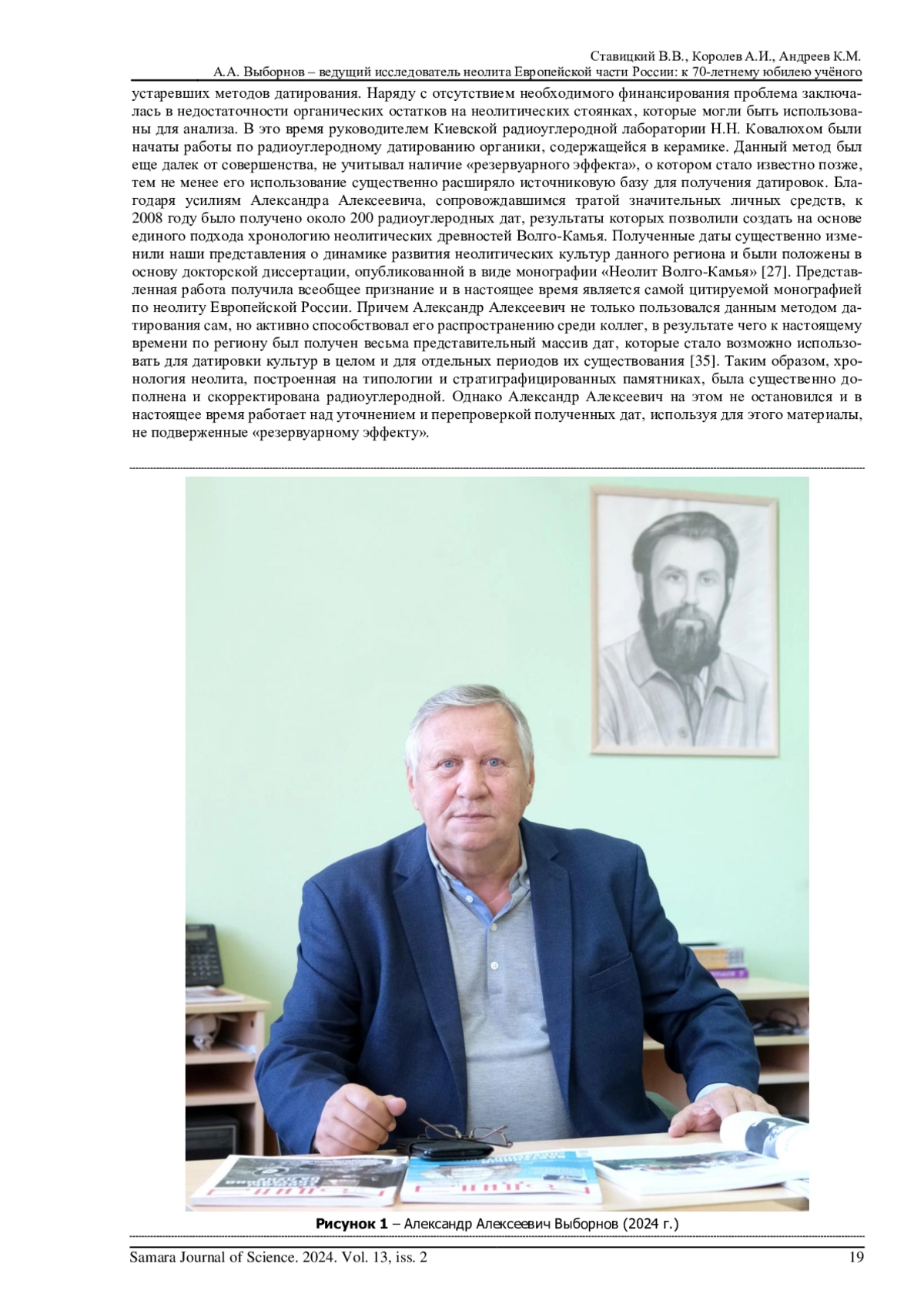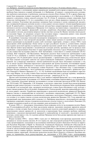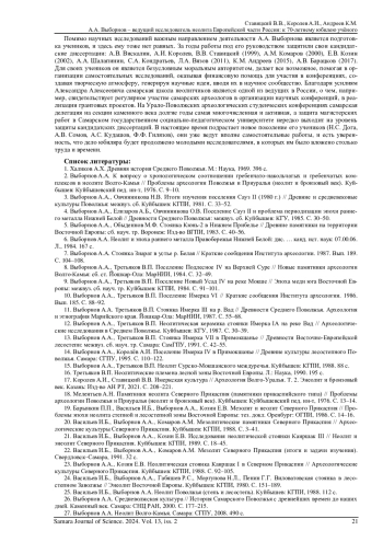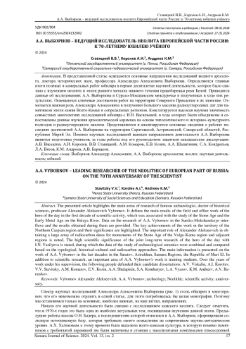 Статья: А. А. ВЫБОРНОВ - ВЕДУЩИЙ ИССЛЕДОВАТЕЛЬ НЕОЛИТА ЕВРОПЕЙСКОЙ ЧАСТИ РОССИИ: К 70-ЛЕТНЕМУ ЮБИЛЕЮ УЧЁНОГО (2024)