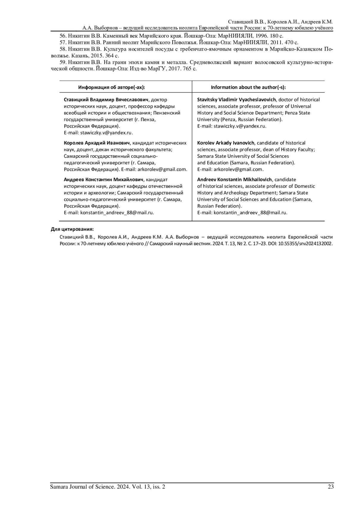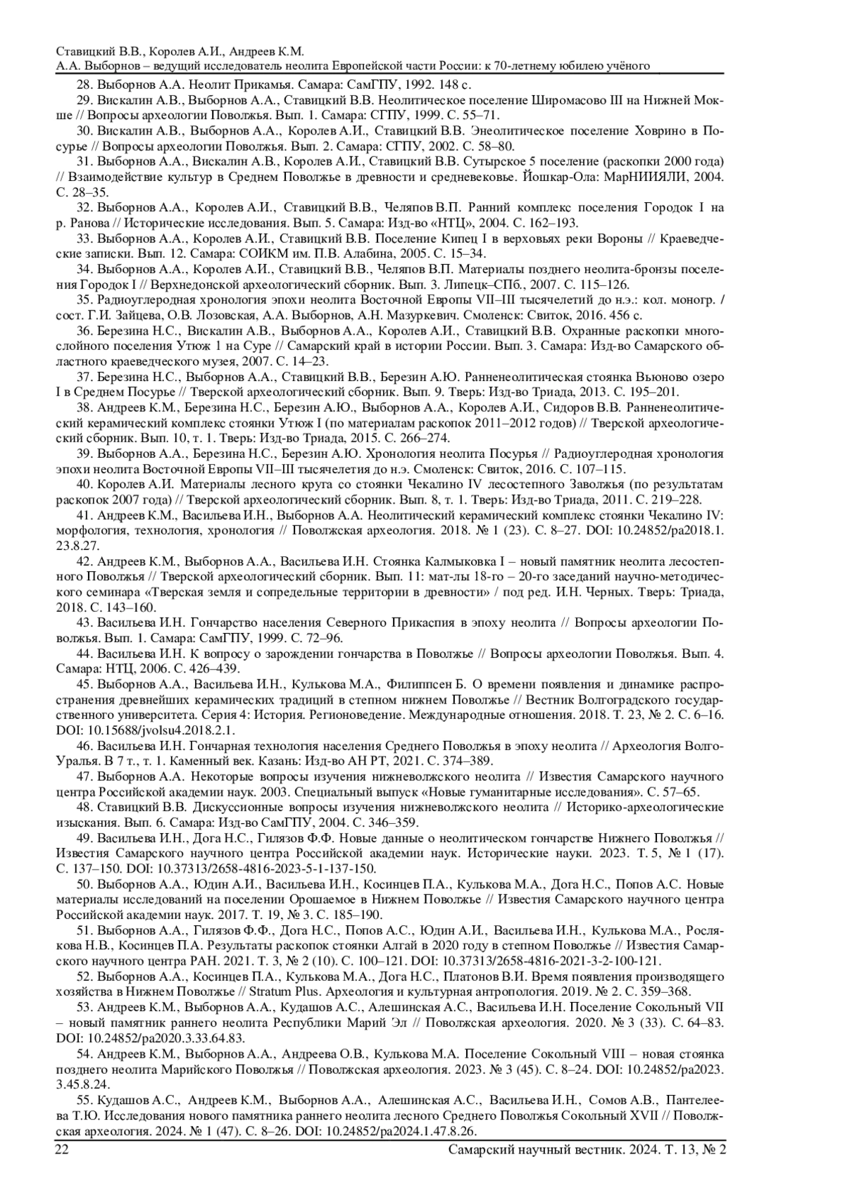 СТАВИЦКИЙ В. В., КОРОЛЕВ А. И., АНДРЕЕВ К. М. А. А. ВЫБОРНОВ - ВЕДУЩИЙ ИССЛЕДОВАТЕЛЬ НЕОЛИТА ЕВРОПЕЙСКОЙ ЧАСТИ РОССИИ: К 70-ЛЕТНЕМУ ЮБИЛЕЮ УЧЁНОГО // САМАРСКИЙ НАУЧНЫЙ ВЕСТНИК. 2024. ТОМ 13, № 2