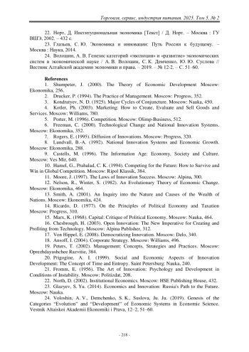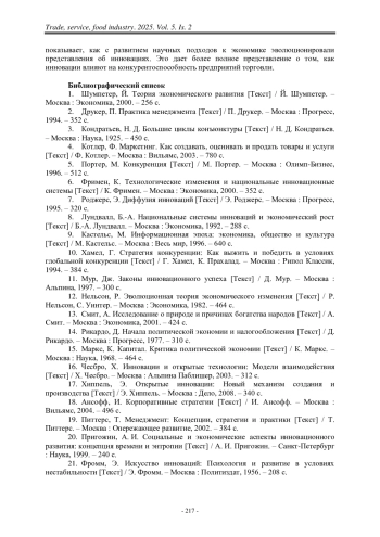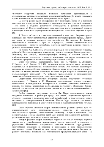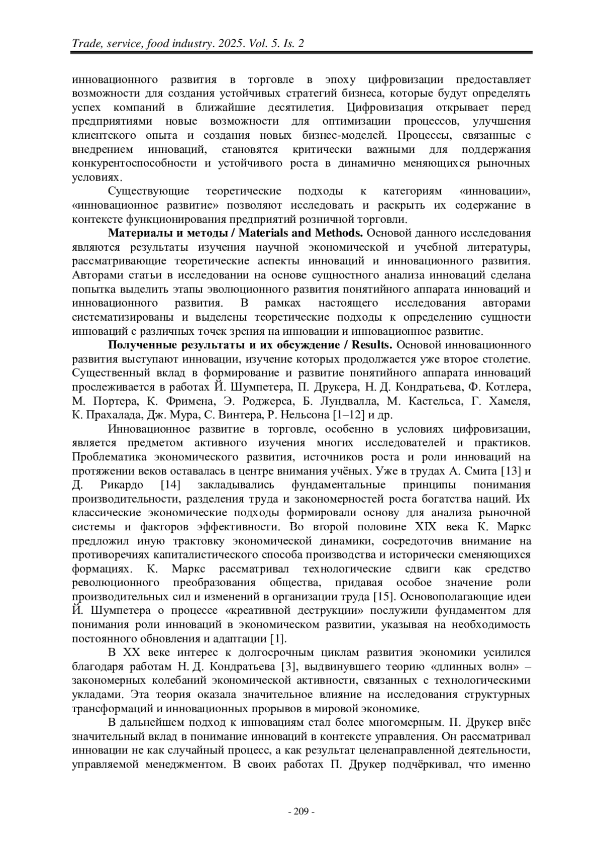 ИЛЬИНА А. С., ВОЛОШИН А. В. СРАВНИТЕЛЬНЫЙ АНАЛИЗ ПОДХОДОВ К ИННОВАЦИОННОМУ РАЗВИТИЮ В ТОРГОВЛЕ // ТОРГОВЛЯ, СЕРВИС, ИНДУСТРИЯ ПИТАНИЯ. 2025. № 2, ТОМ 5