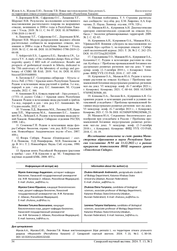 7. Ankipovich E.S., Lagunova E.G., Barsukova I.N., Leonova T.V. A study of the overburden dumps flora at Chernogorsky quarry // BIO web of conferences: Results and prospects of geobotanical research in Siberia, dedicated to the 75th anniversary of the laboratory of ecology and geobotany of CSBG SB RAS. 2019. Vol. 16. DOI: 10.1051/bioconf/20191600001