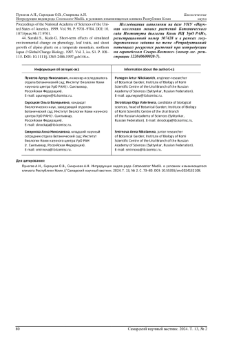 44. Suzuki S., Kudo G. Short-term effects of simulated environmental change on phenology, leaf traits, and shoot growth of alpine plants on a temperate mountain, northern Japan // Global Change Biology. 1997. Vol. 3, iss. S1. P. 108-115. DOI: 10.1111/j.1365-2486.1997.gcb146.x