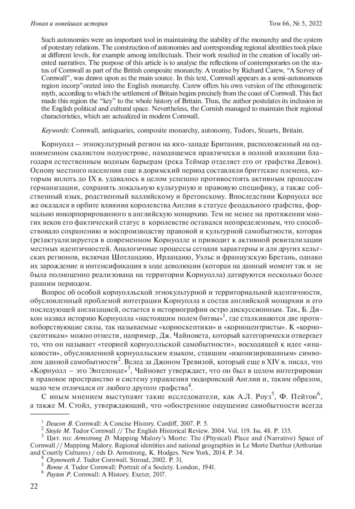 Корнуолл – географически изолированный регион, расположенный на одноименном полуострове на юго-западе Британии. В период раннего Нового времени он представлял собой один из ярких примеров территориальной и этнокультурной автономии, обладавшей неопределенным статусом и специфическими привилегиями, что способствовало сохранению и воспроизводству здесь правовой и культурной самобытности. Подобные автономии являлись важным инструментом для поддержания устойчивости монархии и в целом всей системы потестарных отношений. Как правило, конструирование автономий и связанных с ними региональных идентичностей проводилось на разном уровне, в том числе и в интеллектуальной среде, что было выражено в создании так называемых локально ориентированных нарративов. Цель данной статьи – анализ рефлексии современников о статусе Корнуолла в составе британской композитарной монархии; рассматривается спектр идентичностей, которые были тесно связаны со статусом данной автономии. В качестве основного источника избран один из многочисленных локально ориентированных обзоров – трактат Ричарда Керью «Описание Корнуолла», который до настоящего момента практически не исследовался в контексте становления региональных идентичностей. В данном тексте конкретное локальное сообщество Корнуолла представлено в качестве проекции макрокосма Британии. Керью предлагает собственную корнуоллоориентированную версию этногенетического мифа, согласно которой заселение Британских островов начинается с побережья Корнуолла, что делает его «ключом» ко всей английской истории. Реконструируются нарративные стратегии включения Корнуолла в английское политическое и культурное пространство, которые, с одной стороны, были направлены на преодоление внутренней разнородности территориального государства, а с другой – подчеркивали его статус как уникального сообщества с собственной региональной спецификой и ареалом местных идентичностей