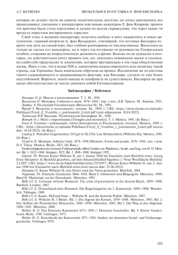 1. Бисмарк О. ф. Мысли и воспоминания. Т. 3. М., 1941 / Bismark O. f. Mysli i vospominaniya. T. 3. M., 1941.