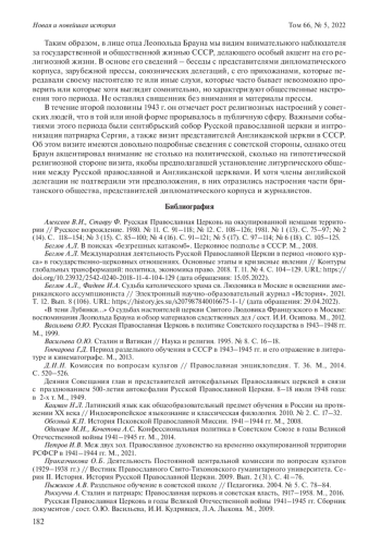 В статье рассматривается один из аспектов изменения религиозной политики советского руководства в ходе Великой Отечественной войны. Известно, что в 1941–1943 гг. одним из главных адресатов этой политики были союзники СССР по антигитлеровской коалиции. Документ, на анализе которого построена данная статья, отражает взгляд английской стороны на происходившее в 1943 г. сближение Русской православной и Англиканской церквей. Это доклад в Ватикан, составленный отцом Леопольдом Брауном, настоятелем московского католического прихода св. Людовика. Американский священник описывает общую картину религиозной и околорелигиозной жизни страны с лета по осень 1943 г.; информирует Ватикан о ставших ему известными обстоятельствах проведения собора Русской православной церкви 1943 г. и избрания на нем патриарха Сергия; подробно останавливается на визите в Москву архиепископа Йоркского Англиканской церкви Гарбетта. Отец Браун акцентирует внимание на религиозной стороне этого визита. Он утверждает, что часть представителей британского дипломатического корпуса и журналистов ожидала, что между Русской православной и Англиканской церквами будет установлено литургическое общение. Эти предположения не были подтверждены членами английской делегации, но отражали настроения части британского общества.