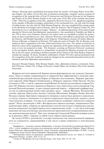 Статья: ПРИЗНАНИЕ ИМПЕРАТОРСКОГО ТИТУЛА РОССИЙСКИХ ГОСУДАРЕЙ СВЯЩЕННОЙ РИМСКОЙ ИМПЕРИЕЙ: ПРОБЛЕМА И ПУТИ ЕЕ РЕШЕНИЯ (ПЕРВАЯ ПОЛОВИНА 1740-Х ГОДОВ) (2022)