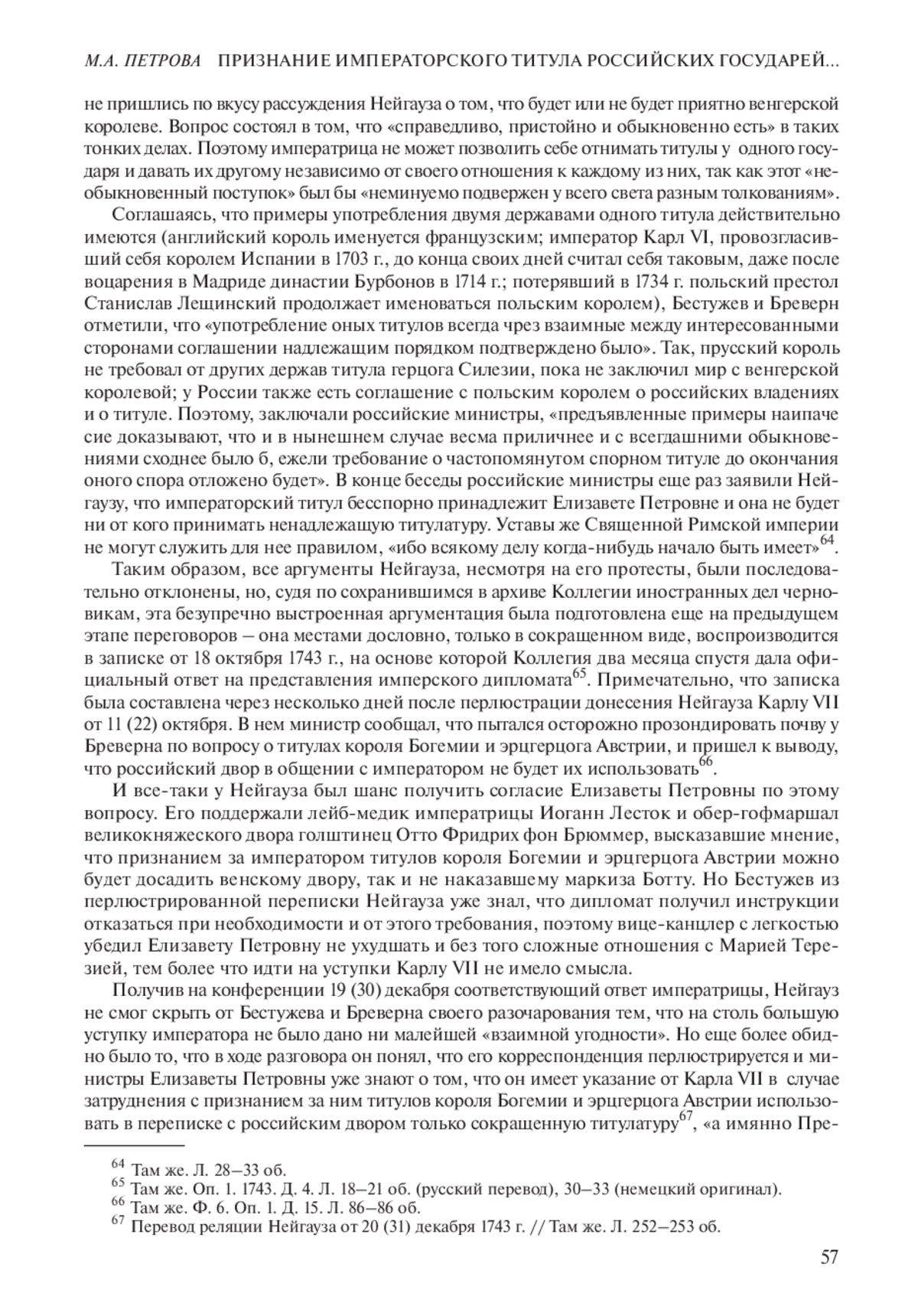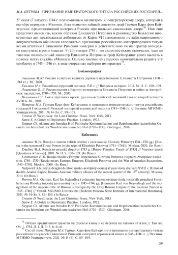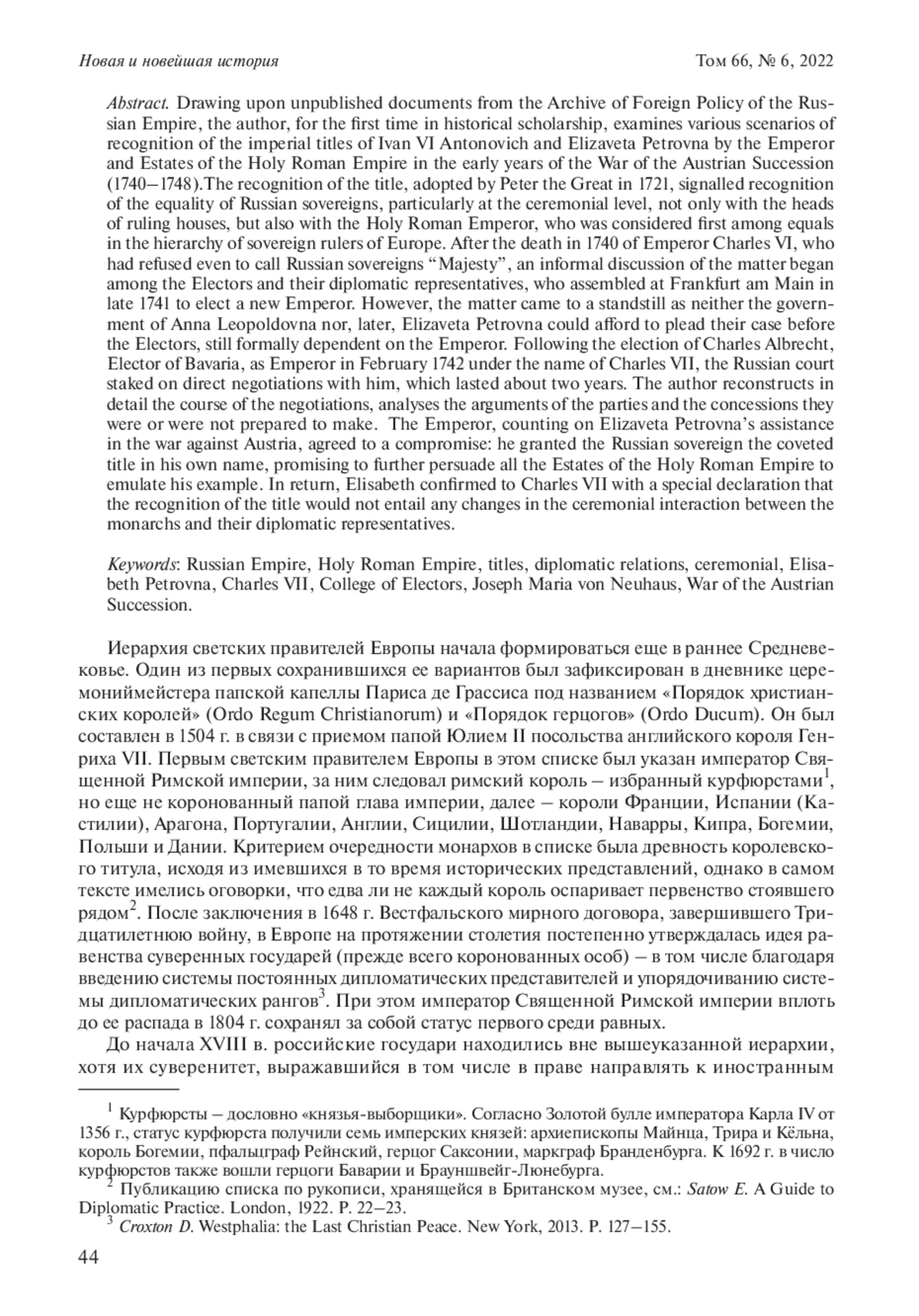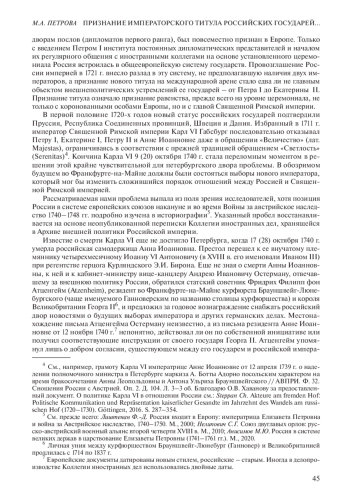 ПЕТРОВА М. А. ПРИЗНАНИЕ ИМПЕРАТОРСКОГО ТИТУЛА РОССИЙСКИХ ГОСУДАРЕЙ СВЯЩЕННОЙ РИМСКОЙ ИМПЕРИЕЙ: ПРОБЛЕМА И ПУТИ ЕЕ РЕШЕНИЯ (ПЕРВАЯ ПОЛОВИНА 1740-Х ГОДОВ) // НОВАЯ И НОВЕЙШАЯ ИСТОРИЯ. 2022. № 6