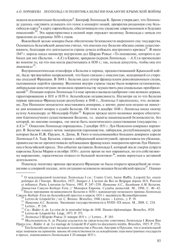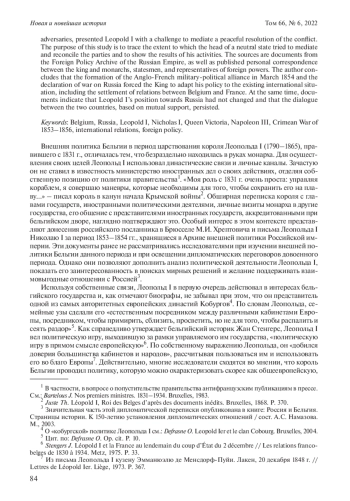 Внешняя политика Бельгии в период царствования короля Леопольда I (1790–1865), правившего с 1831 г., отличалась тем, что безраздельно находилась в руках монарха. Для осуществления своих целей Леопольд I использовал династические связи и личные каналы. Зачастую он не ставил в известность министерство иностранных дел о своих действиях, отделяя собственную позицию от политики правительства1. «Моя роль с 1831 г. очень проста: управляя кораблем, я совершаю маневры, которые необходимы для того, чтобы сохранить его на плаву…» – писал король в канун начала Крымской войны2. Обширная переписка короля с главами государств, иностранными политическими деятелями, личные визиты монарха в другие государства, его общение с представителями иностранных государств, аккредитованными при бельгийском дворе, наглядно подтверждают это. Особый интерес в этом контексте представляют донесения российского посланника в Брюсселе М. И. Хрептовича и письма Леопольда I Николаю I за период 1853–1854 гг., хранящиеся в Архиве внешней политики Российской империи. Эти документы ранее не рассматривались исследователями при изучении внешней политики Бельгии данного периода и при освещении дипломатических переговоров довоенного периода. Однако они позволяют дополнить анализ политической деятельности Леопольда I, показать его заинтересованность в поисках мирных решений и желание поддерживать взаимовыгодные отношения с Россией