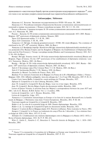 2. Намазова А.С. Российская империя и Королевство Бельгия: установление дипломатических отношений и первые посланники // Новая и новейшая история. 2021. № 5. С. 94-104. EDN: MMOBSZ