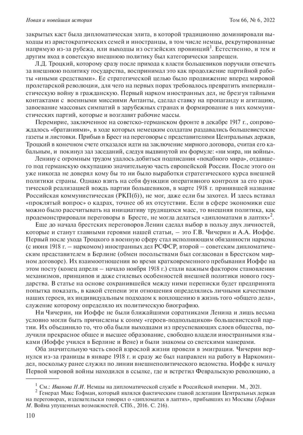 В статье на основе служебной переписки наркома и полпреда реконструирована подготовка ключевых решений в сфере советско-германских отношений на исходе Первой мировой войны, показана роль человеческого фактора в этом процессе, механизм урегулирования ведомственных и личных конфликтов, залогом которого выступал авторитет В. И. Ленина. Автор приходит к выводу, что процесс становления советской внешней политики в 1918 г. шел чрезвычайно быстро, в целом соответствуя темпу событий, и продвигался вперед, преодолевая ошибки. Заложенные в первый год работы Наркоминдела традиции и нормы оказывали немалое влияние на последующую историю советской дипломатии.