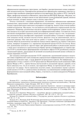 5. Белякова Н.А., Пивоваров Н.Ю. Религиозная дипломатия на службе советского государства в годы холодной войны (в период Н.С. Хрущева и Л.И. Брежнева) // Контуры глобальных трансформаций: политика, экономика, право. 2018. Т. 11. № 4. С. 130-149. EDN: YMQQUH