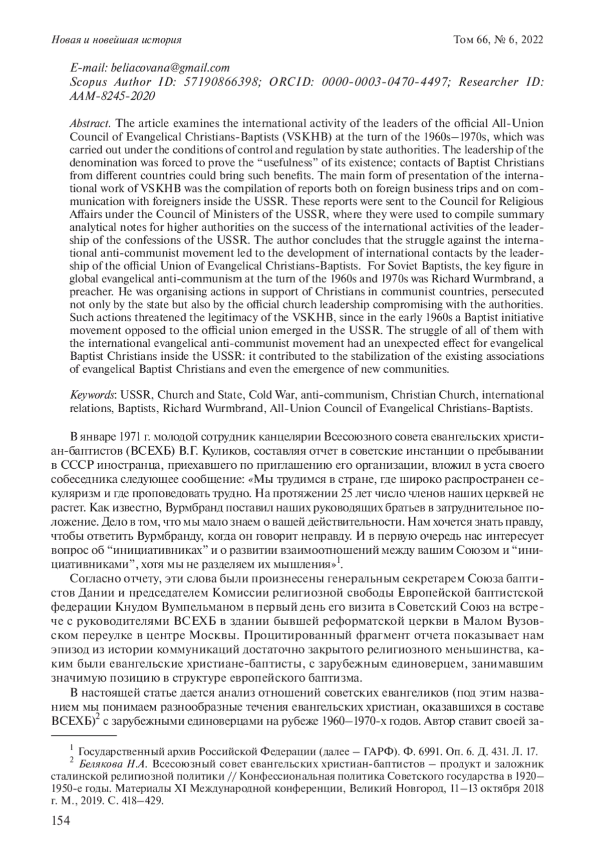В статье рассматривается международная деятельность руководителей Всесоюзного совета евангельских христиан-баптистов (ВСЕХБ) на рубеже 1960–1970-х годов, которая осуществлялась в условиях контроля и регламентирования государственными инстанциями. Руководство конфессии вынуждено было доказывать «полезность» своего существования; такую пользу могли приносить контакты христиан-баптистов из разных стран. Основной формой презентации международной работы ВСЕХБ было составление отчетов как о зарубежных командировках, так и об общении с иностранцами внутри СССР. Эти отчеты направлялись в Совет по делам религий при Совете министров СССР, где на их основе составлялись обобщающие аналитические записки для вышестоящих инстанций об успешности международной деятельности руководства конфессий СССР. Автор приходит к выводу, что борьба с международным антикоммунистическим движением стала поводом для развития международных контактов руководства официального Союза евангельских христиан-баптистов. Ключевой фигурой глобального евангелического антикоммунизма на рубеже 1960–1970-х годов для советских баптистов был проповедник Ричард Вурмбранд. Он организовывал акции в поддержку христиан в коммунистических странах, преследуемых не только со стороны государства, но и официальным церковным руководством, идущим на компромисс с властями. Такие действия угрожали легитимности ВСЕХБ, поскольку в начале 1960-х годов в СССР возникло оппозиционное официальному союзу баптистское движение «инициативников». Борьба ВСЕХБ с международным евангелическим антикоммунистическим движением имела для евангельских христиан-баптистов внутри СССР неожиданный эффект: она способствовала стабилизации положения существующих объединений евангельских христиан-баптистов и даже появлению новых общин.