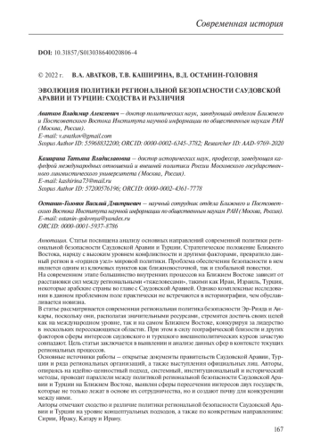 Статья посвящена анализу основных направлений современной политики региональной безопасности Саудовской Аравии и Турции. Стратегическое положение Ближнего Востока, наряду с высоким уровнем конфликтности и другими факторами, превратило данный регион в «гордиев узел» мировой политики. Проблема обеспечения безопасности в нем является одним из ключевых пунктов как ближневосточной, так и глобальной повестки. На современном этапе большинство внутренних процессов на Ближнем Востоке зависит от расстановки сил между региональными «тяжеловесами», такими как Иран, Израиль, Турция, некоторые арабские страны во главе с Саудовской Аравией. Однако комплексные исследования в данном проблемном поле практически не встречаются в историографии, чем обуславливается новизна.