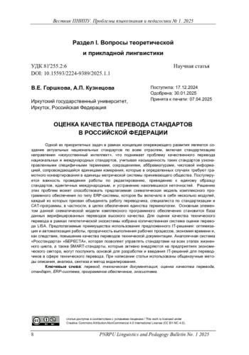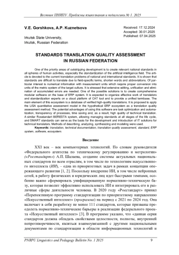 Одной из приоритетных задач в рамках концепции опережающего развития является создание актуальных национальных стандартов по всем отраслям, включая стандартизацию направления «искусственный интеллект», что поднимает проблему качественного перевода национальных и международных стандартов, учитывая насыщенность таких стандартов узконаправленными специфичными терминами, сокращениями, аббревиатурами, числовой информацией, сопровождающейся единицами измерения, которые в определенных случаях требуют грамотного конвертирования в единицы метрической системы принимающего общества. Постулируется важность проведения работы по редактированию, приведению к единому образцу стандартов, идентичных международным, и устранению накопившихся неточностей. Решению этих проблем может способствовать предлагаемая схематическая модель комплексного программного обеспечения по типу ERP-системы, которое бы включало в себя несколько модулей, каждый из которых призван объединять работу переводчика, специалиста по стандартизации и CAT-программы, в частности, в целях обеспечения единства терминологии. Основным элементом данной схематической модели комплексного программного обеспечения становится база данных верифицированных переводов высокого качества. Для оценки качества технического перевода в рамках гипотетической экосистемы избрана количественная система оценки перевода LISA. Предполагаемые преимущества использования предложенного IT-решения: оптимизация и автоматизация работы, прозрачность выполнения рабочих процессов, экономия времени и, как следствие, повышение качества переводов технической документации. Аналогичная система «Росстандарта» «БЕРЕСТА», которая позволяет управлять стандартами на всех этапах жизненного цикла, а также SMART-стандарты, которые активно внедряются на предприятиях экономического сектора, могут послужить основой для разработки и введения IT-решений для переводчиков в сфере технического перевода. При написании статьи использованы общенаучные методы описания, анализа, синтеза и метод моделирования