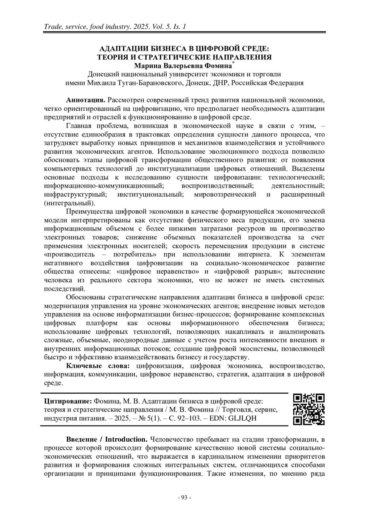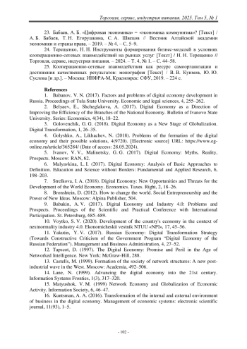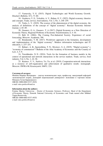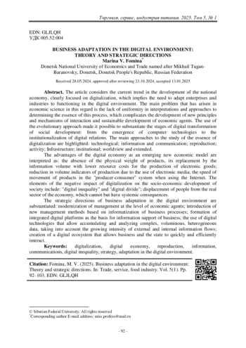 ФОМИНА М. В. АДАПТАЦИИ БИЗНЕСА В ЦИФРОВОЙ СРЕДЕ: ТЕОРИЯ И СТРАТЕГИЧЕСКИЕ НАПРАВЛЕНИЯ // ТОРГОВЛЯ, СЕРВИС, ИНДУСТРИЯ ПИТАНИЯ. 2025. № 1, ТОМ 5