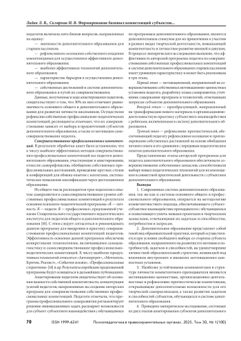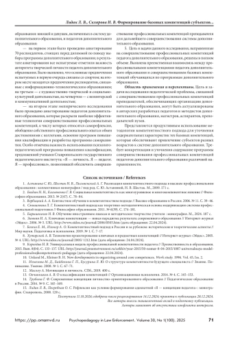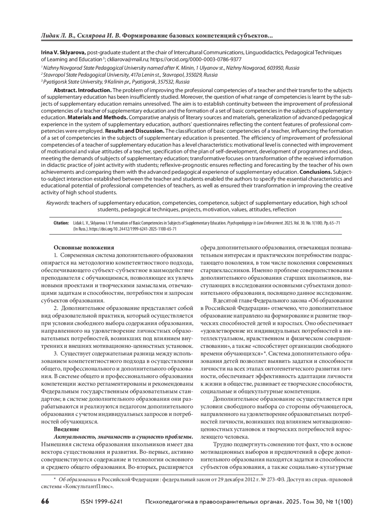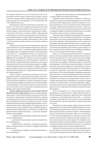 Проблема совершенствования профессиональных компетенций преподавателя и их трансляция субъектам дополнительного образования является малоизученной. Остается нерешенным вопрос, какой круг компетенций осваивают субъекты дополнительного образования. Цель — установление преемственной взаимосвязи между совершенствованием профессиональных компетенций педагога дополнительного образования и формированием комплекса базовых компетенций у субъектов дополнительного образования. Материалы и методы. Сравнительносопоставительный анализ литературных источников и материалов, обобщение передового педагогического опыта в системе дополнительного образования, авторские анкеты, отражающие содержательные особенности профессиональных компетенций. Результаты и обсуждение. Представлена классификация базовых компетенций педагога, влияющих на формирование комплекса компетенций у субъектов дополнительного образования. Эффективность совершенствования профессиональных компетенций педагога дополнительного образования имеет уровневую характеристику: мотивационный уровень, связанный с совершенствованием у педагога мотивационно-ценностных установок, конкретизацией плана саморазвития, разработки программ и замыслов, отвечающих запросам субъектов дополнительного образования; преобразующий уровень, направленный на преобразование и трансформацию полученной информации в дидактическую практику совместной деятельности с обучающимися; рефлексивно-прогностический, обеспечивающий рефлексию и прогнозирование педагогом собственных достижений и сравнение их с передовым педагогическим опытом дополнительного образования. Выводы. Субъектсубъектное взаимодействие, сложившееся между педагогом и обучающимися, позволило конкретизировать сущностные характеристики и воспитательный потенциал профессиональных компетенций педагогов, а также обеспечило их трансформацию в совершенствование творческой деятельности старшеклассников.