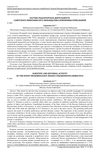 В данной статье впервые реконструируется неизвестная сторона в биографии видного советского ученого-микробиолога - академика медицины, профессора, доктора медицинских наук Зинаиды Виссарионовны Ермольевой (1898-1974), связанная с ее деятельностью по осуществлению редакционного руководства в издании сборников научных статей, периодических сборников переводов, обзоров и рефератов иностранной периодической литературы, а также научно-практического журнала «Антибиотики». Основной тематикой изданий, в которых З. В. Ермольева выступала в качестве научного редактора, была проблема антибиотиков (пенициллин, стрептомицин и ряд других) и интерферона. В качестве основных источников используются неопубликованные документы Государственного архива Российской Федерации и Российского государственного архива экономики, а также материалы сборников статей и периодических изданий, публиковавшихся в 1940-1970-е гг. под редакцией З. В. Ермольевой. В представленной публикации анализируется характер научных изданий и их тематическое наполнение. Характеризуется значение научно-практического журнала «Антибиотики» для науки и практики медицины, освещается характер его выпуска, публикации статей и география авторов и их учреждений, которые они представляли; рассматривается состав редакционной коллегии и редакционного совета, а также роль З. В. Ермольевой в руководстве журналом.