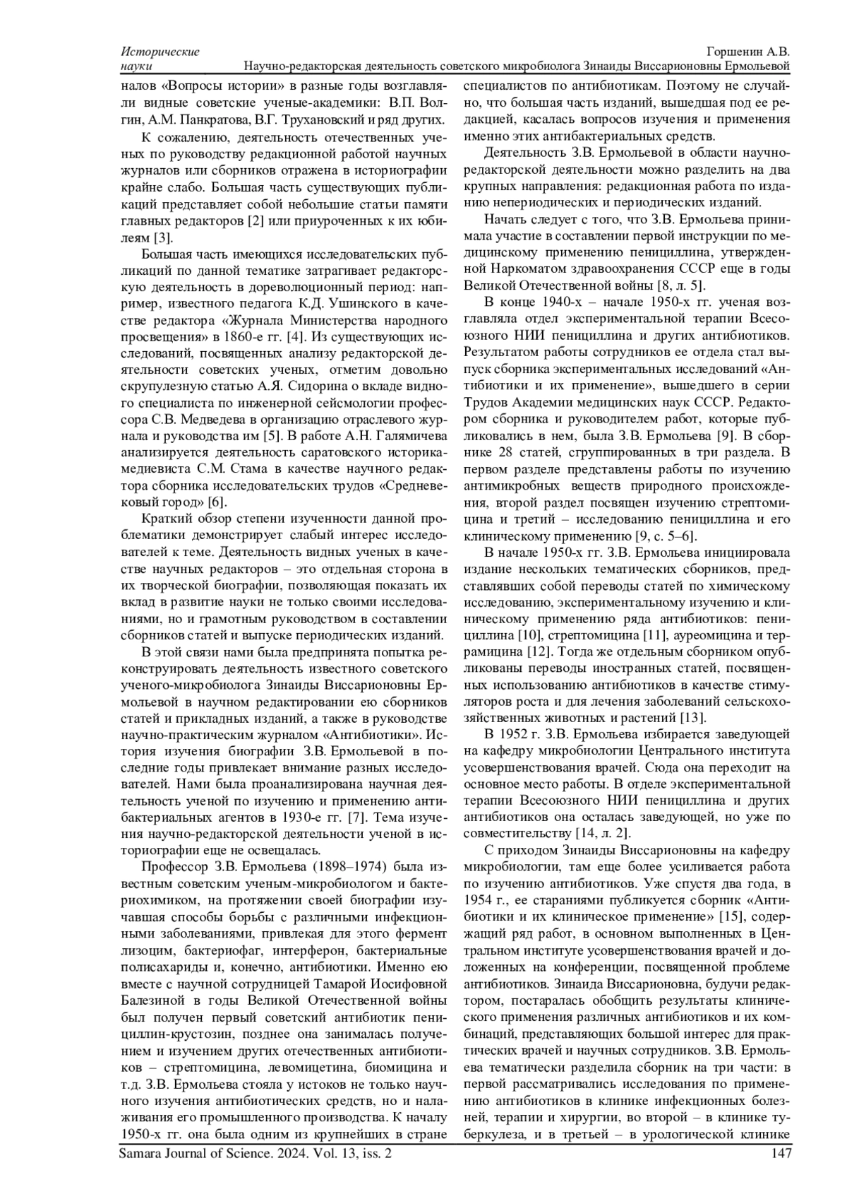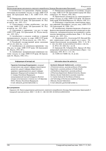 7. Горшенин А.В. История научно-практической деятельности советского микробиолога З.В. Ермольевой по изучению и применению антибактериальных агентов в 1930-е гг.: монография. Самара: Инсома-пресс, 2022. 224 с.