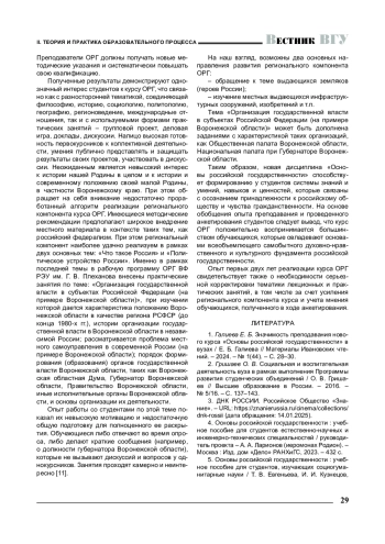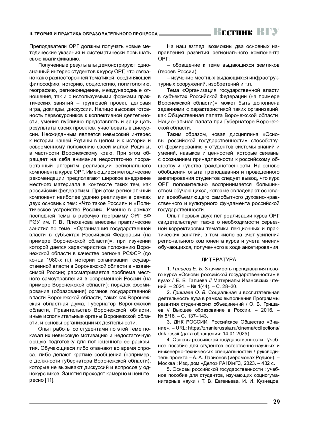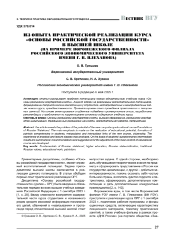 Статья: ИЗ ОПЫТА ПРАКТИЧЕСКОЙ РЕАЛИЗАЦИИ КУРСА «ОСНОВЫ РОССИЙСКОЙ ГОСУДАРСТВЕННОСТИ» В ВЫСШЕЙ ШКОЛЕ (НА ПРИМЕРЕ ВОРОНЕЖСКОГО ФИЛИАЛА РОССИЙСКОГО ЭКОНОМИЧЕСКОГО УНИВЕРСИТЕТА ИМЕНИ Г. В. ПЛЕХАНОВА) (2025)