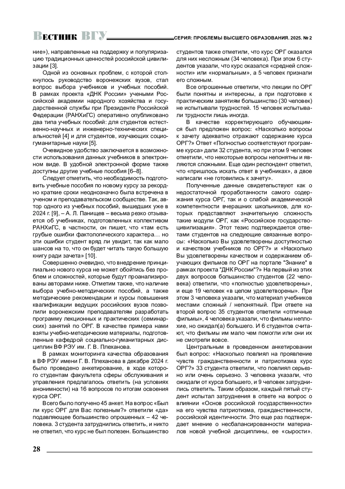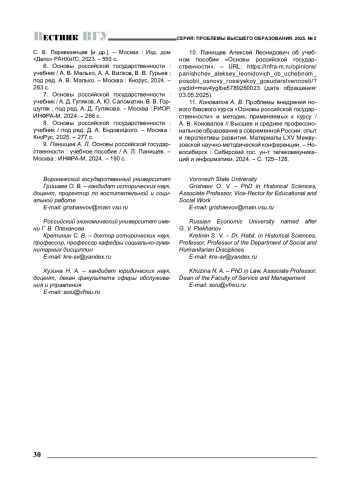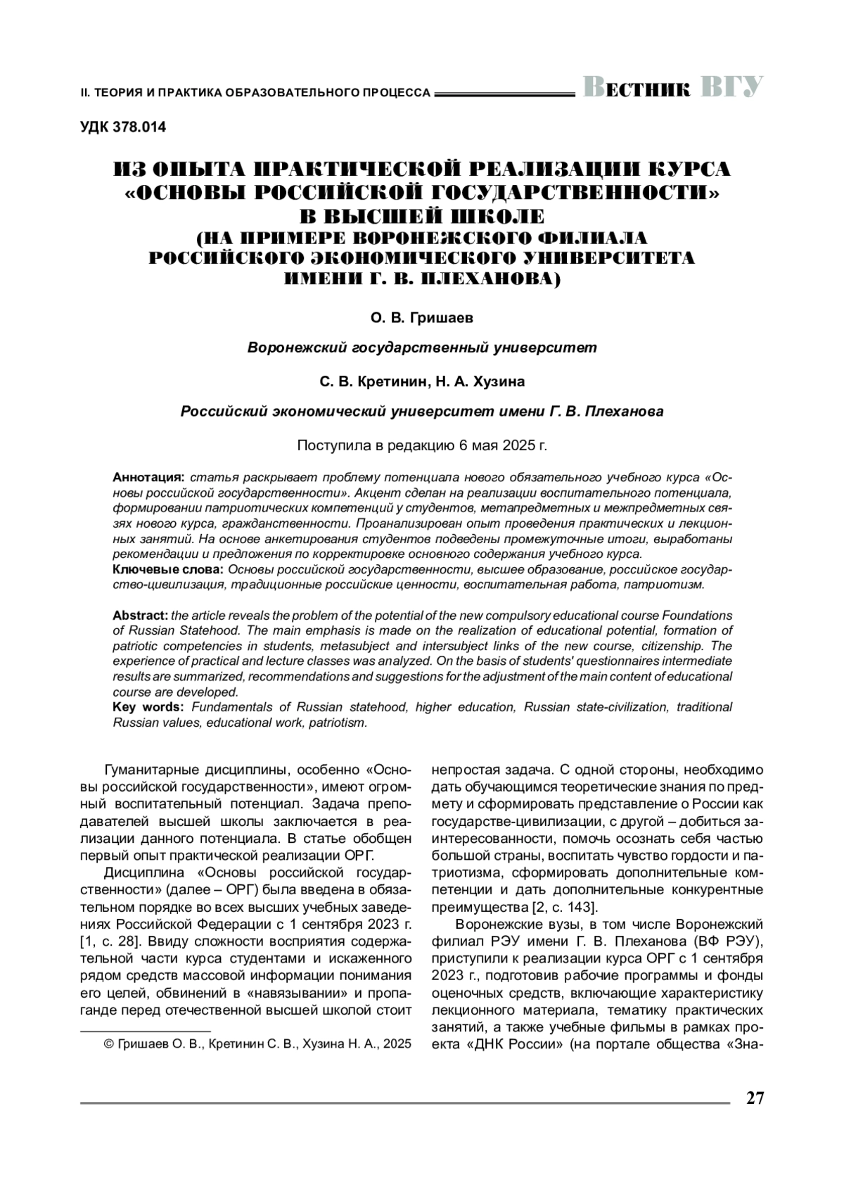 ГРИШАЕВ О.В., КРЕТИНИН С. В., ХУЗИНА Н.А. ИЗ ОПЫТА ПРАКТИЧЕСКОЙ РЕАЛИЗАЦИИ КУРСА «ОСНОВЫ РОССИЙСКОЙ ГОСУДАРСТВЕННОСТИ» В ВЫСШЕЙ ШКОЛЕ (НА ПРИМЕРЕ ВОРОНЕЖСКОГО ФИЛИАЛА РОССИЙСКОГО ЭКОНОМИЧЕСКОГО УНИВЕРСИТЕТА ИМЕНИ Г. В. ПЛЕХАНОВА) // ВЕСТНИК ВОРОНЕЖСКОГО ГОСУДАРСТВЕННОГО УНИВЕРСИТЕТА. СЕРИЯ: ПРОБЛЕМЫ ВЫСШЕГО ОБРАЗОВАНИЯ. 2025. № 2