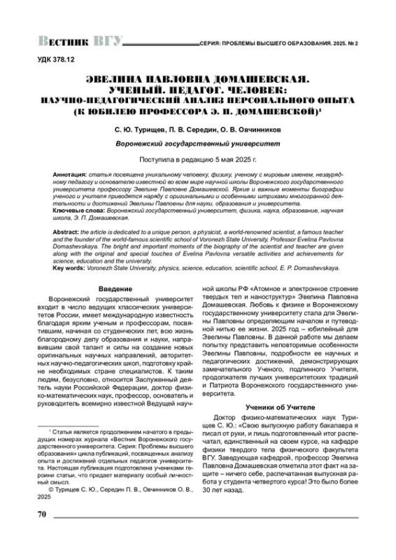 ТУРИЩЕВ С. Ю., СЕРЕДИН П. В., ОВЧИННИКОВ О. В. ЭВЕЛИНА ПАВЛОВНА ДОМАШЕВСКАЯ. УЧЕНЫЙ. ПЕДАГОГ. ЧЕЛОВЕК: НАУЧНО-ПЕДАГОГИЧЕСКИЙ АНАЛИЗ ПЕРСОНАЛЬНОГО ОПЫТА (К ЮБИЛЕЮ ПРОФЕССОРА Э. П. ДОМАШЕВСКОЙ) // ВЕСТНИК ВОРОНЕЖСКОГО ГОСУДАРСТВЕННОГО УНИВЕРСИТЕТА. СЕРИЯ: ПРОБЛЕМЫ ВЫСШЕГО ОБРАЗОВАНИЯ. 2025. № 2