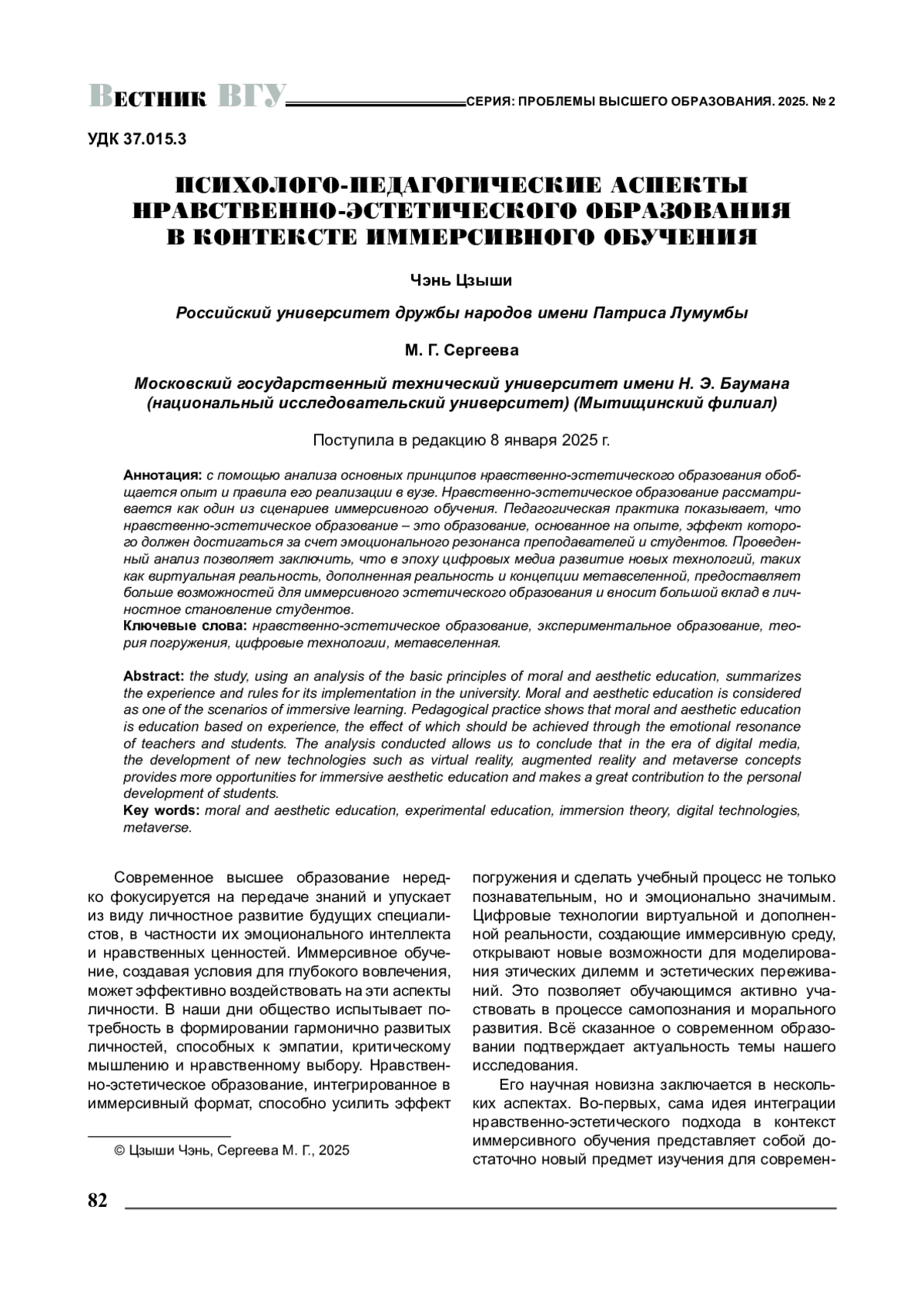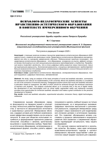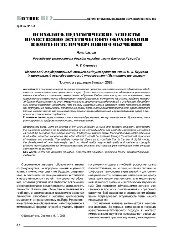 С помощью анализа основных принципов нравственно-эстетического образования обобщается опыт и правила его реализации в вузе. Нравственно-эстетическое образование рассматривается как один из сценариев иммерсивного обучения. Педагогическая практика показывает, что нравственно-эстетическое образование - это образование, основанное на опыте, эффект которого должен достигаться за счет эмоционального резонанса преподавателей и студентов. Проведенный анализ позволяет заключить, что в эпоху цифровых медиа развитие новых технологий, таких как виртуальная реальность, дополненная реальность и концепции метавселенной, предоставляет больше возможностей для иммерсивного эстетического образования и вносит большой вклад в личностное становление студентов.