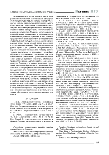 6. 周屹. 全沉浸式VR技术在高校艺术设计专业实验教学的改革与实践 // 高教学刊. - 2020. - № 24. -C. 139-146. [Чжоу И. Реформа и практика использования технологии полного погружения в виртуальную реальность в экспериментальном преподавании искусства и дизайна в колледжах и университетах /И. Чжоу // Журнал высшего образования. - 2020. -№ 24. - C. 139-146.].