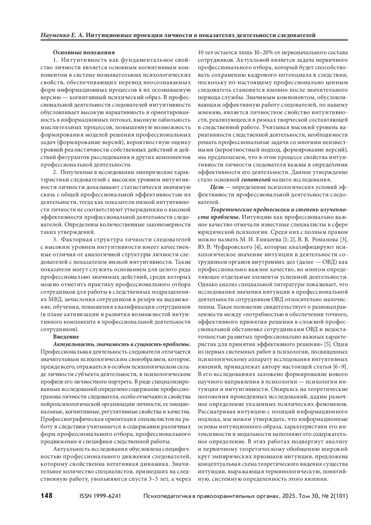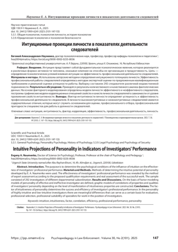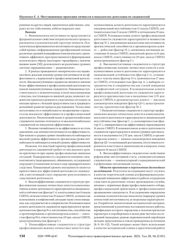 Интуиция представляет собой фундаментальное психологическое явление, которое реализуется в различных формах активности человека, оказывая влияние на способы ее организации и продуктивность. Цель — определение психологических условий влияния интуиции на эффективность профессиональной деятельности следователей. Материалы и методы. Использованы авторские методики определения интуиционного потенциала личности. Эффективность профессиональной работы следователей определялась методом экспертной оценки по предложенным квалификационным требованиям и реальной оценки успешности работы. Выборку составили 292 следователя различной ведомственной подчиненности. Результаты и обсуждение. Приводятся результаты количественного и качественного анализа фактологических данных. На основе факторного моделирования определены модели личности эффективного и неэффективного следователя, построены графические модели корреляционных отношений свойств и качеств личности следователей в зависимости от уровня проявления свойств интуитивности. Выводы. Фактор интуитивности личности определяет успешность и эффективность профессиональной деятельности следователя. В личности высокоинтуитивных и низкоинтуитивных следователей имеются содержательные отличия, которые могут служить основанием для оценки, профессионального отбора, профессиональной пригодности специалистов для работы в должности следователей.