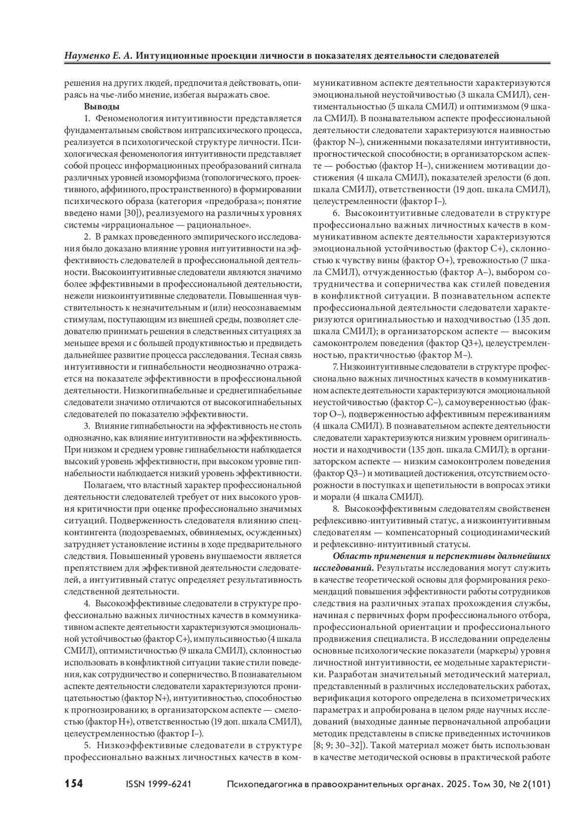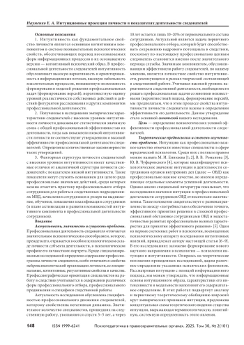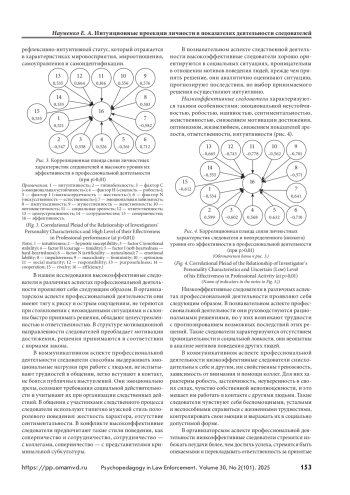 1. Интуитивность как фундаментальное свойство личности является основным когнитивным компонентом в системе познавательных психологических свойств, обеспечивающих перевод неосознаваемых форм информационных процессов в их осознаваемую версию — когнитивный психический образ. В профессиональной деятельности следователей интуитивность обусловливает высокую вариативность и ориентированность в информационных потоках, высокую лабильность мыслительных процессов, повышенную возможность формирования моделей решения профессиональных задач (формирование версий), вероятностную оценку уровней реалистичности собственных действий и действий фигурантов расследования и других компонентов профессиональной деятельности.