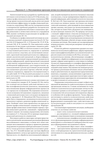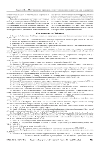 13. Васильева И. В., Григорьев П. Е., Иванцов С. В., Игнатов А. Н. Особенности интуиции в предсказании опасности у сотрудников правоохранительных органов // Вестник Московского университета МВД России. 2016. № 7. С. 237–240.