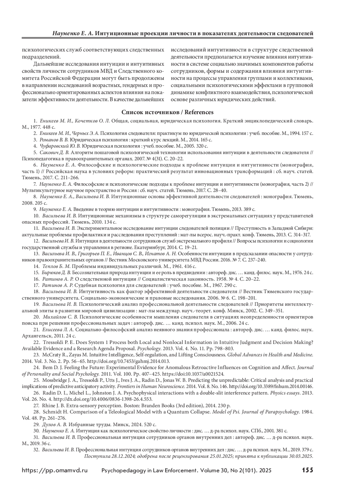 31. Васильева И. В. Профессиональная интуиция сотрудников органов внутренних дел : автореф. дис. … д-ра психол. наук. М., 2019. 36 с.