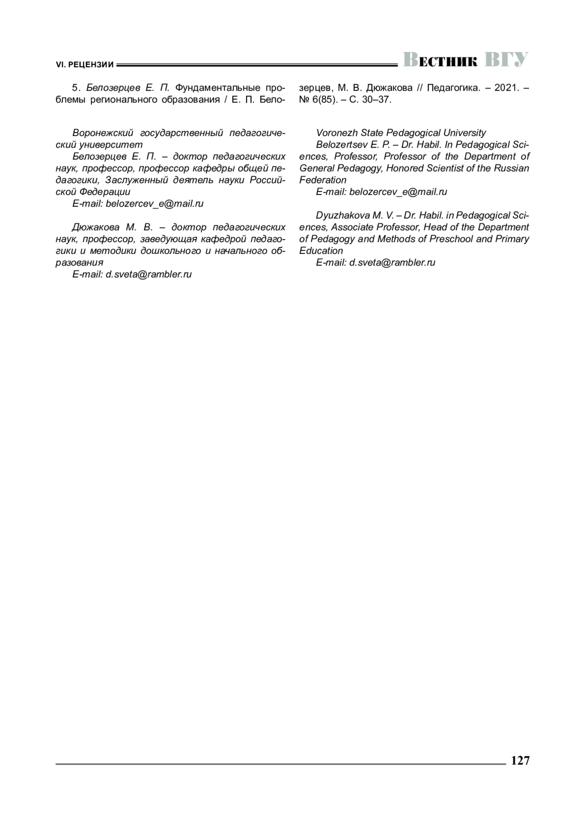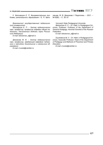 5. Белозерцев Е. П. Фундаментальные проблемы регионального образования / Е. П. Белозерцев, М. В. Дюжакова // Педагогика. - 2021. -№ 6(85). - С. 30-37.