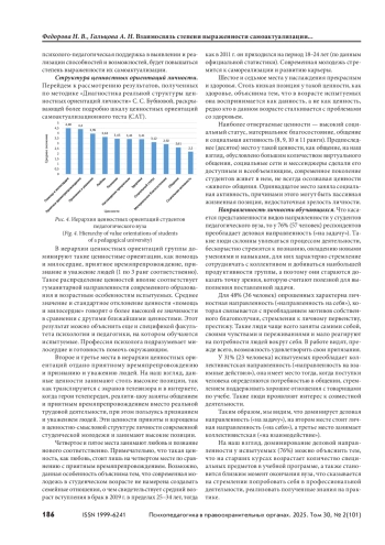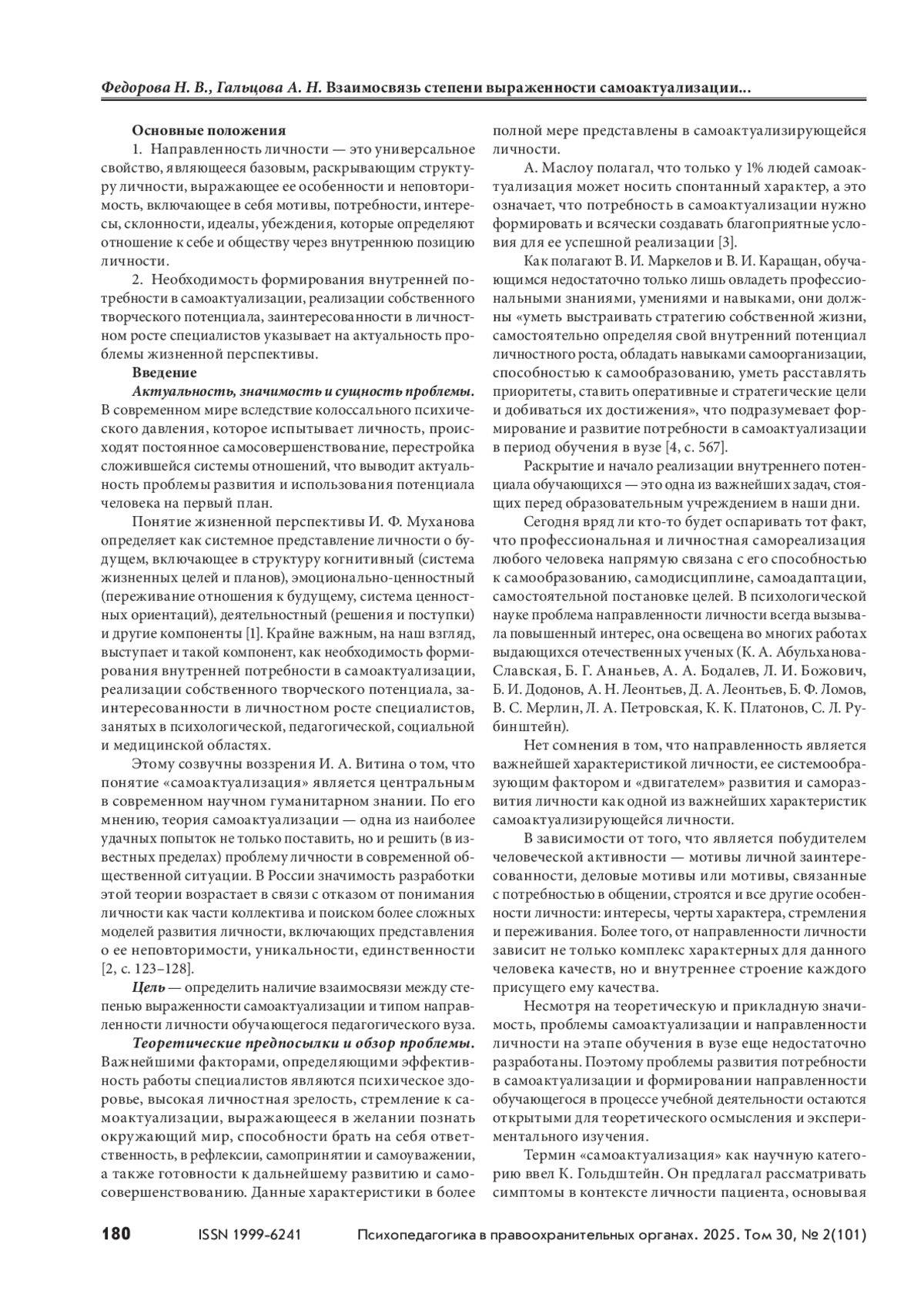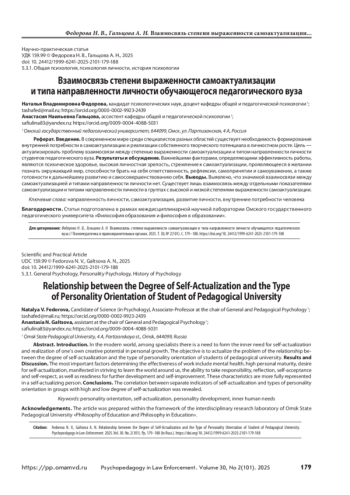 В современном мире среди специалистов разных областей существует необходимость формирования внутренней потребности в самоактуализации и реализации собственного творческого потенциала в личностном росте. Цель — актуализировать проблему взаимосвязи между степенью выраженности самоактуализации и типом направленности личности студентов педагогического вуза. Результаты и обсуждение. Важнейшими факторами, определяющими эффективность работы, являются психическое здоровье, высокая личностная зрелость, стремление к самоактуализации, проявляющееся в желании познать окружающий мир, способности брать на себя ответственность, рефлексии, самопринятии и самоуважении, а также готовности к дальнейшему развитию и самосовершенствованию себя. Выводы. Выявлено, что значимой взаимосвязи между самоактуализацией и типами направленности личности нет. Существует лишь взаимосвязь между отдельными показателями самоактуализации и типами направленности личности в группах с высокой и низкой степенями выраженности самоактуализации.