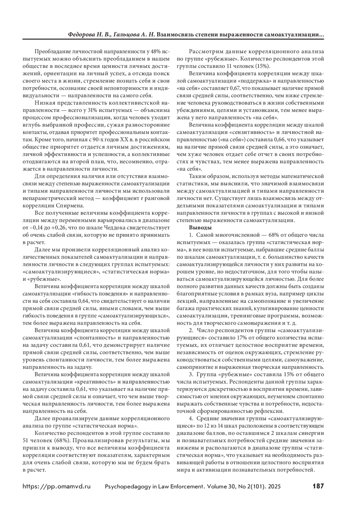 Служебно-деятельностные особенности: интенсивность, напряженность деятельности, необходимость решения оперативно-служебных задач в условиях неопределенности — являются условиями, способствующими развитию утомленности сотрудников органов внутренних дел. Другим немаловажным фактором, препятствующим и усиливающим данное состояние, выступают темпоральные характеристики личности сотрудника, к которым относятся отношение ко времени, его функции и временная направленность. Цель — выявление связей утомленности с временной направленностью, функциями и отношением ко времени у сотрудников с разным уровнем утомленности. Материалы и методы. Респондентами выступили 187 сотрудников органов внутренних дел (90 слушателей первоначальной подготовки Санкт-Петербургского университета МВД России, а также 97 сотрудников со стажем служебной деятельности от 1 года до 10 лет, проходивших повышение квалификации в СПбУ МВД России). Использовался комплекс авторских психодиагностических опросников: «Субъективная оценка уровня утомленности личности», «Шкала субъективного отношения к времени», «Субъективная оценка временной направленности» и анкета «Оценка темпорального типа личности». Статистическими методами выступили анализ первичных описательных статистик, регрессионный и сравнительный анализ. Результаты и обсуждение. У сотрудников с низким уровнем утомленности превалирует пластичное отношение ко времени в сочетании с мобилизующей функцией времени и ресурсной временной направленностью с доминированием ориентации на настоящее. Сотрудники с умеренным уровнем утомленности отличаются временной зависимостью — пристрастным отношением ко времени, которое выполняет ограничивающую функцию, и фиксированной временной направленностью с доминированием ориентации на будущее. Для сотрудников с высоким уровнем утомленности характерно равнодушное отношение в сочетании с подавляющей функцией времени и фиксированной временной направленностью с доминированием ориентации на прошлое. Выводы. Отношение ко времени, временная направленность и функции времени выступают детерминантами утомленности, наиболее значимыми среди которых являются временная зависимость (пристрастное отношение ко времени), ограничивающая и подавляющая функции времени, а также фиксированная временная направленность на прошлое и будущее.