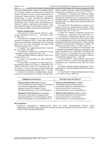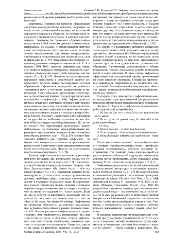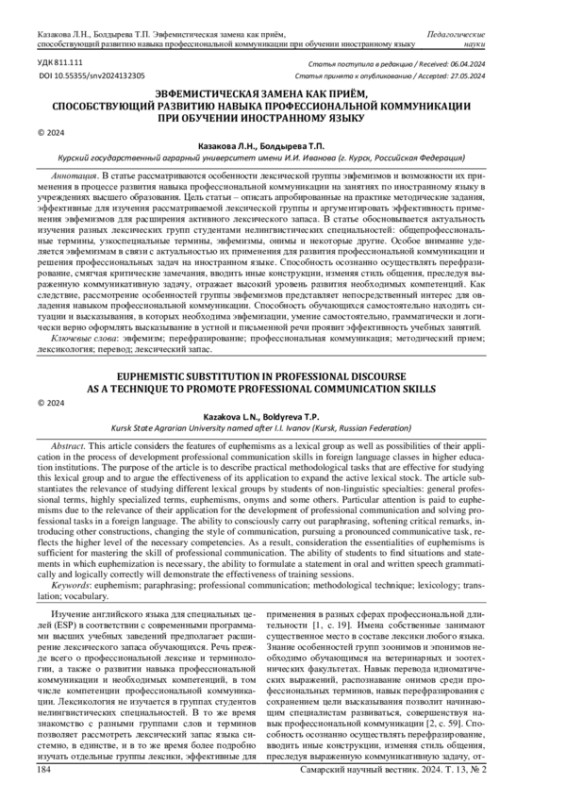 КАЗАКОВА Л. Н., БОЛДЫРЕВА Т. П. ЭВФЕМИСТИЧЕСКАЯ ЗАМЕНА КАК ПРИЁМ, СПОСОБСТВУЮЩИЙ РАЗВИТИЮ НАВЫКА ПРОФЕССИОНАЛЬНОЙ КОММУНИКАЦИИ ПРИ ОБУЧЕНИИ ИНОСТРАННОМУ ЯЗЫКУ // САМАРСКИЙ НАУЧНЫЙ ВЕСТНИК. 2024. ТОМ 13, № 2
