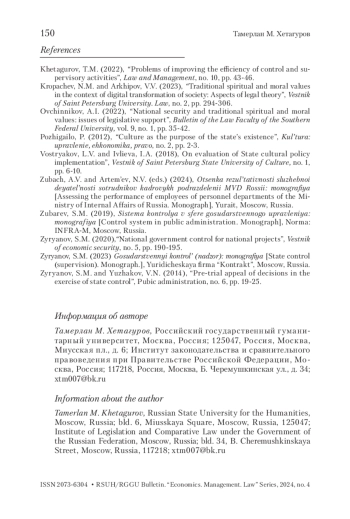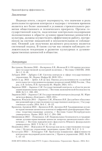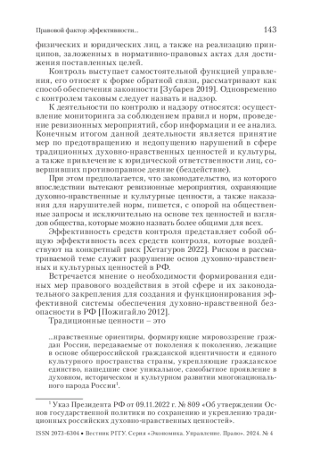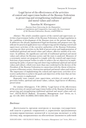 В статье рассматриваются отдельные аспекты контрольно-надзорной деятельности органов государственной власти РФ, ее нормативно-правовое регулирование в условиях развития российского государства на текущем временном этапе. Анализируются уже существующие отдельные правовые механизмы, а также предлагаются новые значимые для практического применения способы совершенствования и развития контрольно-надзорной деятельности исполнительных органов власти Российской Федерации, функционирующих в сфере сохранения и укрепления традиционных духовно-нравственных ценностей и культуры, эффективной модели ее существования. Кроме того, рассматриваются значение и роль традиционных духовно-нравственных ценностей и культуры для российского общества и государства. Предлагаются меры системного характера по осуществлению контрольно-надзорной функции органов государственной власти для достижения поставленных задач в реализации политики сохранения и укрепления традиционных духовно-нравственных ценностей и культуры, не единожды нашедшие свое закрепление в указах Президента Российской Федерации в связи с угрозой деструктивности российского общества, разрушения духовно-нравственных ценностей и культуры. Подчеркивается важное значение реализации контрольно-надзорной деятельности уполномоченных на то органов исполнительной власти для достижения полезных для общества и государства целей и задач.