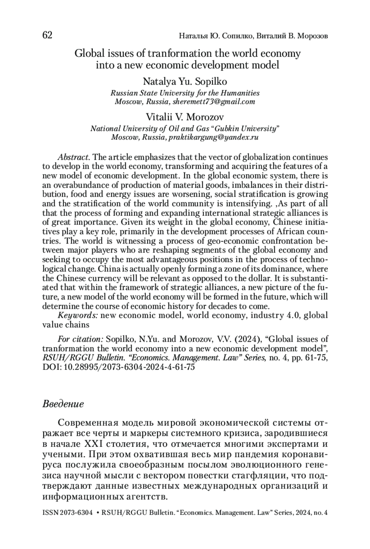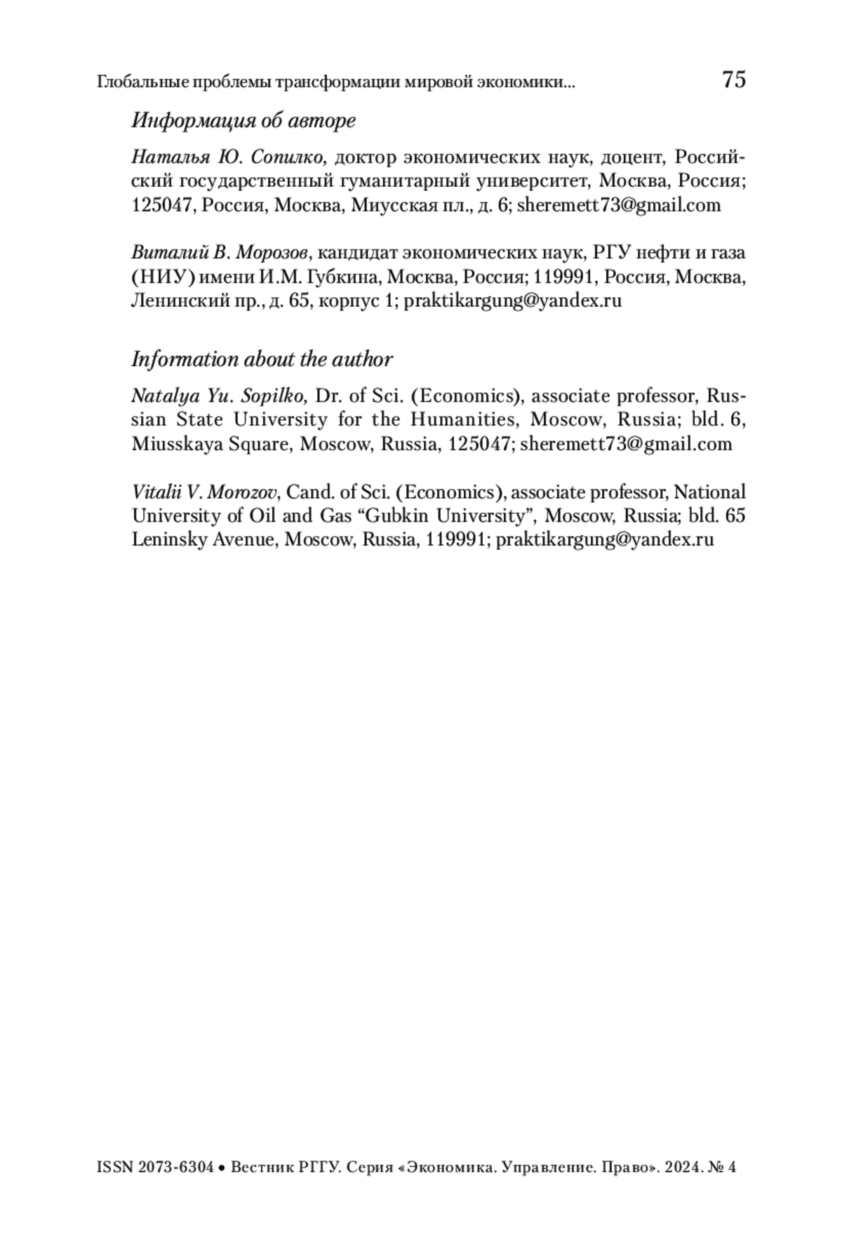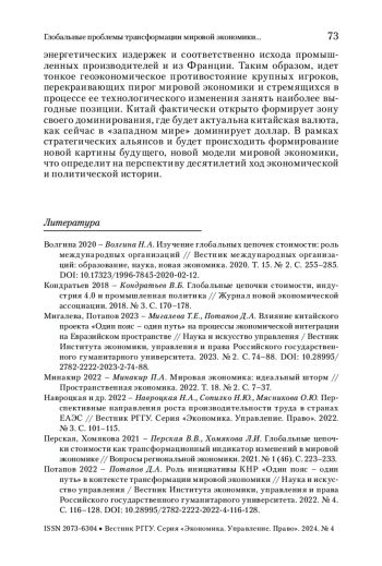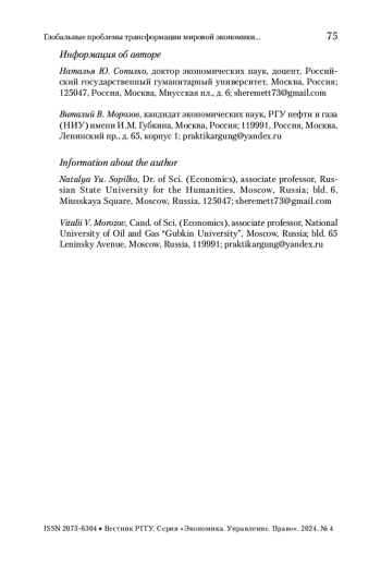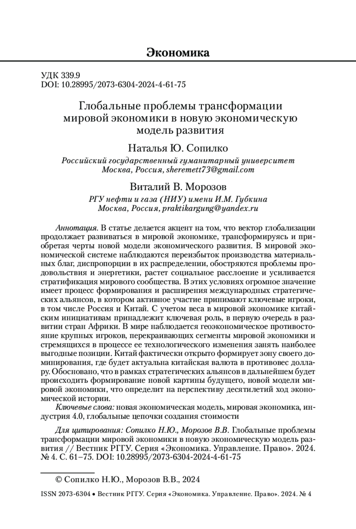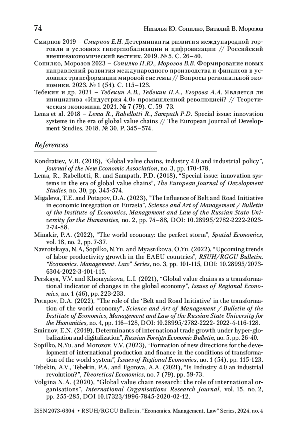 9. Сопилко, Морозов 2023 - Сопилко Н.Ю., Морозов В.В. Формирование новых направлений развития международного производства и финансов в условиях трансформации мировой системы // Вопросы региональной экономики. 2023. № 1 (54). С. 115-123.