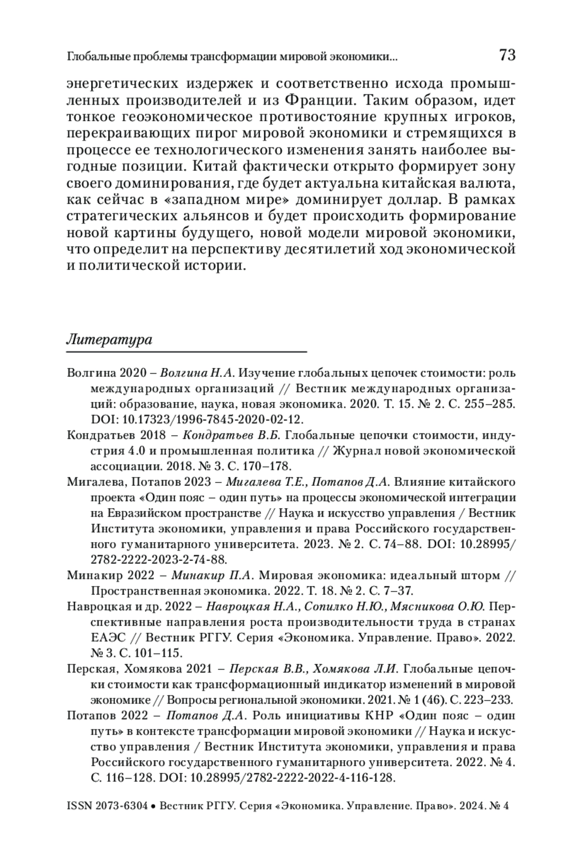 7. Потапов 2022 - Потапов Д.А. Роль инициативы КНР «Один пояс - один путь» в контексте трансформации мировой экономики // Наука и искусство управления / Вестник Института экономики, управления и права Российского государственного гуманитарного университета. 2022. № 4. С. 116-128. https://doi.org/10.28995/2782-2222-2022-4-116-128.