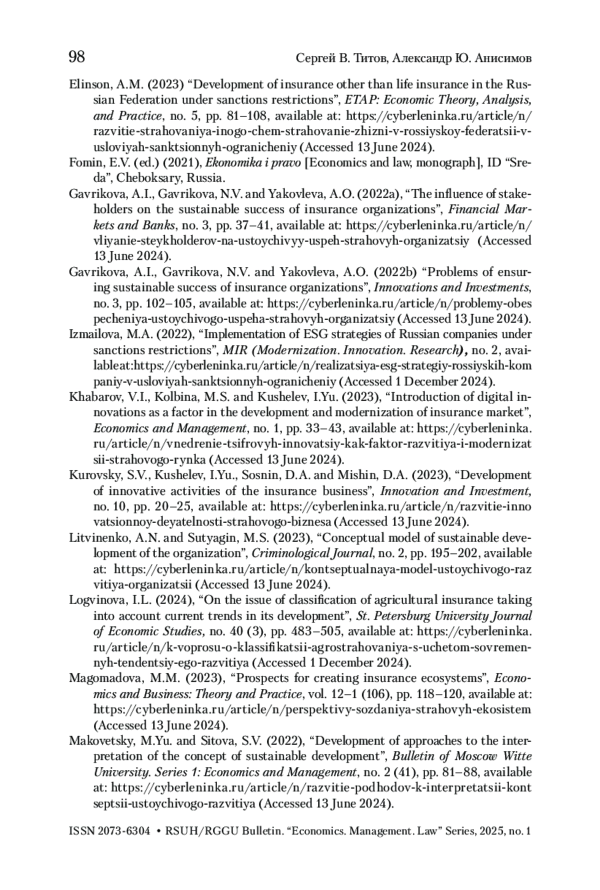 7. Елинсон 2023 - Елинсон А.М. Развитие страхования иного, чем страхование жизни, в Российской Федерации в условиях санкционных ограничений // Этап. 2023. № 5. С. 81-108. URL: https://cyberleninka.ru/article/n/razvitie-strahovaniya-inogo-chem-strahovanie-zhizni-v-rossiyskoy-federatsii-v-usloviyah-sanktsionnyh-ogranicheniy (дата обращения 13 июня 2024).