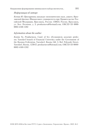 1. Базуева, Дубровская 2021 - Базуева Е.В., Дубровская Ю.В. Обоснование причин неэффективности системы институтов пространственного развития РФ в контексте параметров качества // Вестник Пермского университета. Сер. «Экономика». 2021. Т. 16. № 2. С. 150-167. https://doi.org/10.17072/1994-9960-2021-2-150-167.