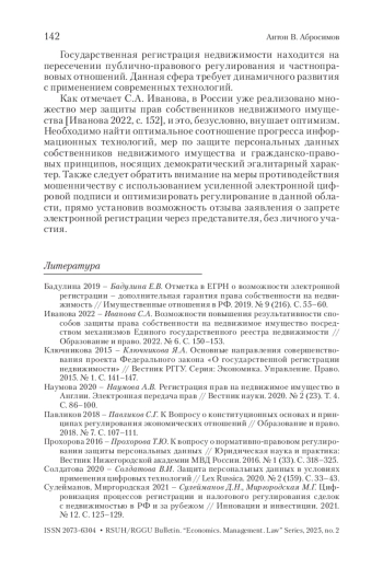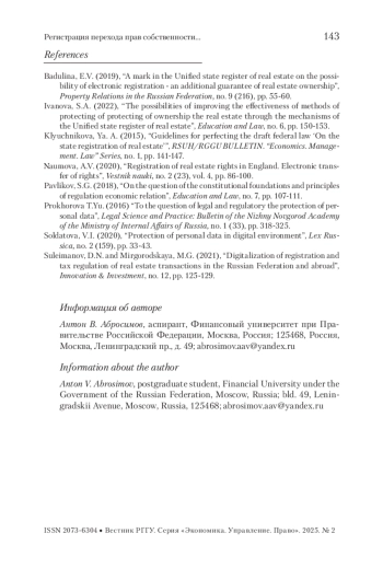 АБРОСИМОВ А. В. РЕГИСТРАЦИЯ ПЕРЕХОДА ПРАВ СОБСТВЕННОСТИ НА НЕДВИЖИМОЕ ИМУЩЕСТВО: ПРОБЛЕМЫ И ПЕРСПЕКТИВЫ // ВЕСТНИК РГГУ. СЕРИЯ: ЭКОНОМИКА. УПРАВЛЕНИЕ. ПРАВО. 2025. № 2