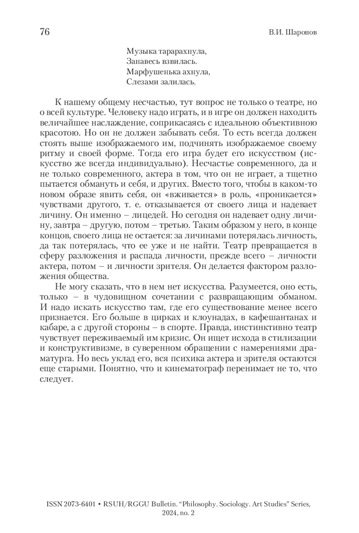 Статья посвящена малоизвестному тексту Л. П. Карсавина, опубликованному в журнале «Балтийский альманах» в мае 1928 г. Несмотря на кажущуюся краткость, текст Л. П. Карсавина «Об актере и театре» вобрал в себя многие биографические обстоятельства биографии автора, общественные дискуссии, которые определили взгляды и оценки Карсавина на зрелищное искусство, литературу и радикальные изменения в современной культуре. Изучение этих во многом деталей и связей, прямых и скрытых намеков, содержащихся в статье, позволяет нам лучше понять философские взгляды автора и особенности его личности.
