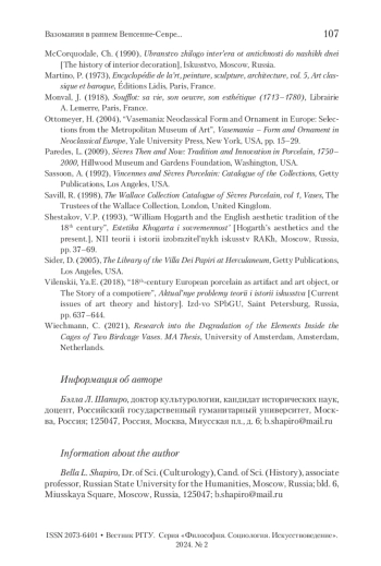 3. Виленский 2018 - Виленский Я.Э. Европейский фарфор XVIII века как артефакт и арт-объект, или История компотьера // Актуальные проблемы теории и истории искусства. СПб.: Изд-во СПбГУ, 2018. С. 637-644.