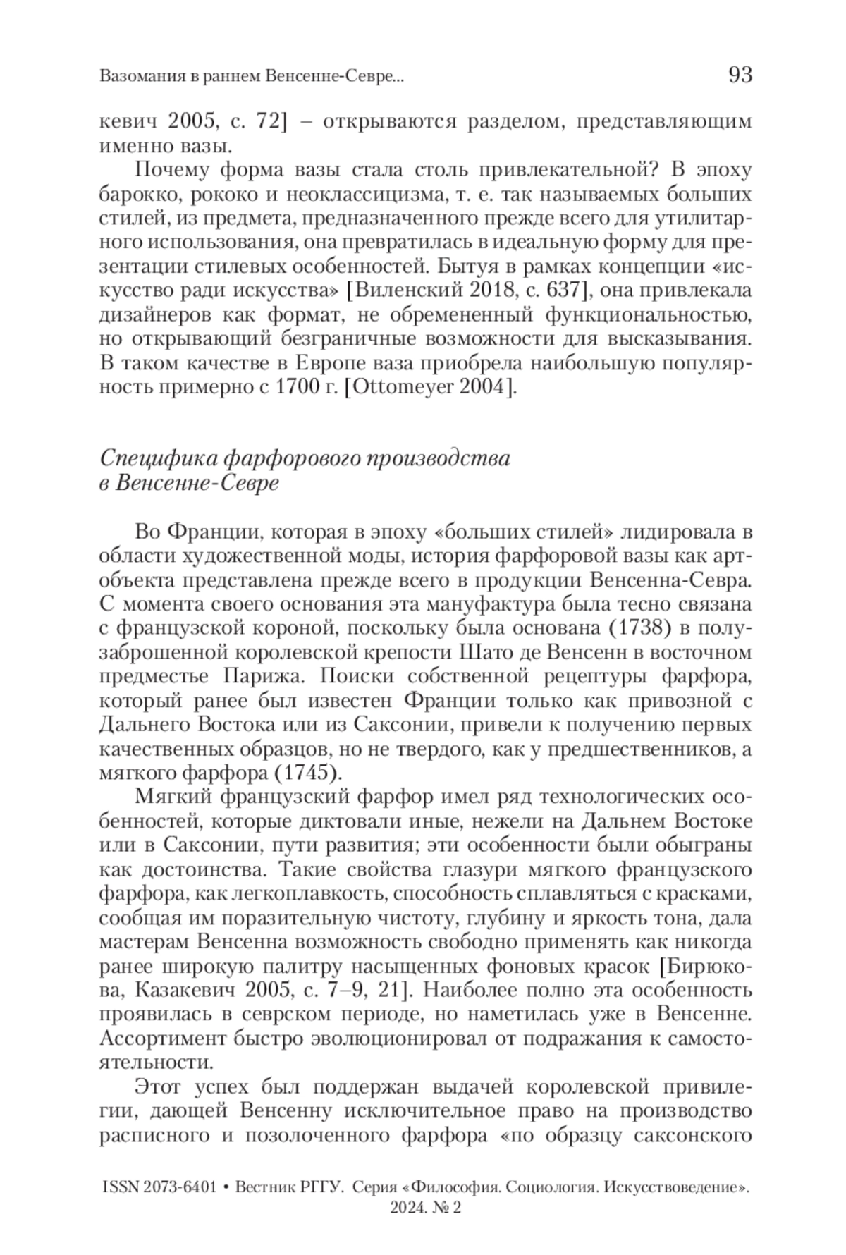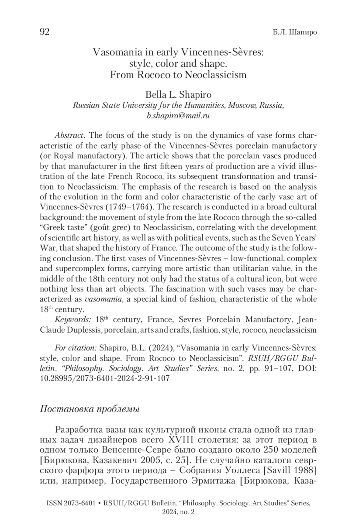 В центре внимания данного исследования находится динамика вазовых форм, характерная для раннего этапа развития фарфоровой мануфактуры Венсенна-Севра (Королевской мануфактуры). Показывается, что фарфоровые вазы, выпущенные этой мануфактурой в первые пятнадцать лет их производства, являются яркой иллюстрацией зрелого французского рококо, его последующей трансформации и перехода к неоклассицизму. Акцент в исследовании базируется на анализе эволюции формы и цвета, характерных для раннего вазового искусства ВенсеннаСевра (1749–1764). Исследование проводится на широком культурном фоне: движение стиля от зрелого рококо через так называемый греческий вкус (goûtgrec) к неоклассицизму соотносится с развитием научного искусствознания, а также и с определяющими историю Франции политическими событиями, такими как Семилетняя война. Итогом исследования стал следующий вывод: первые вазы Венсенна-Севра – малофункциональные, сложных и сверхсложных форм, несущие скорее художественную, нежели утилитарную ценность, в середине XVIII столетия не только имели статус культурной иконы, но и представляли собой не что иное, как арт-объекты. Увлечение такими вазами можно охарактеризовать как вазоманию, особого рода моду, характерную для всего XVIII столетия.