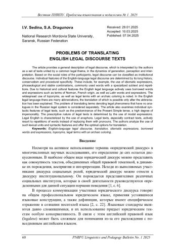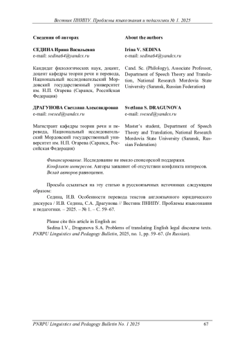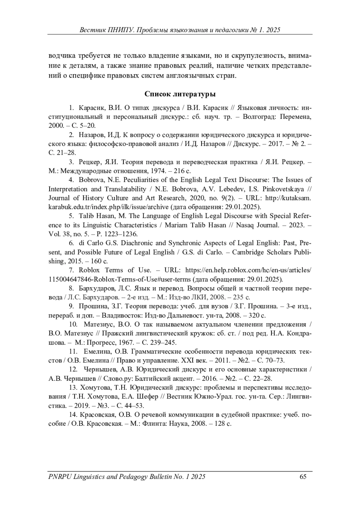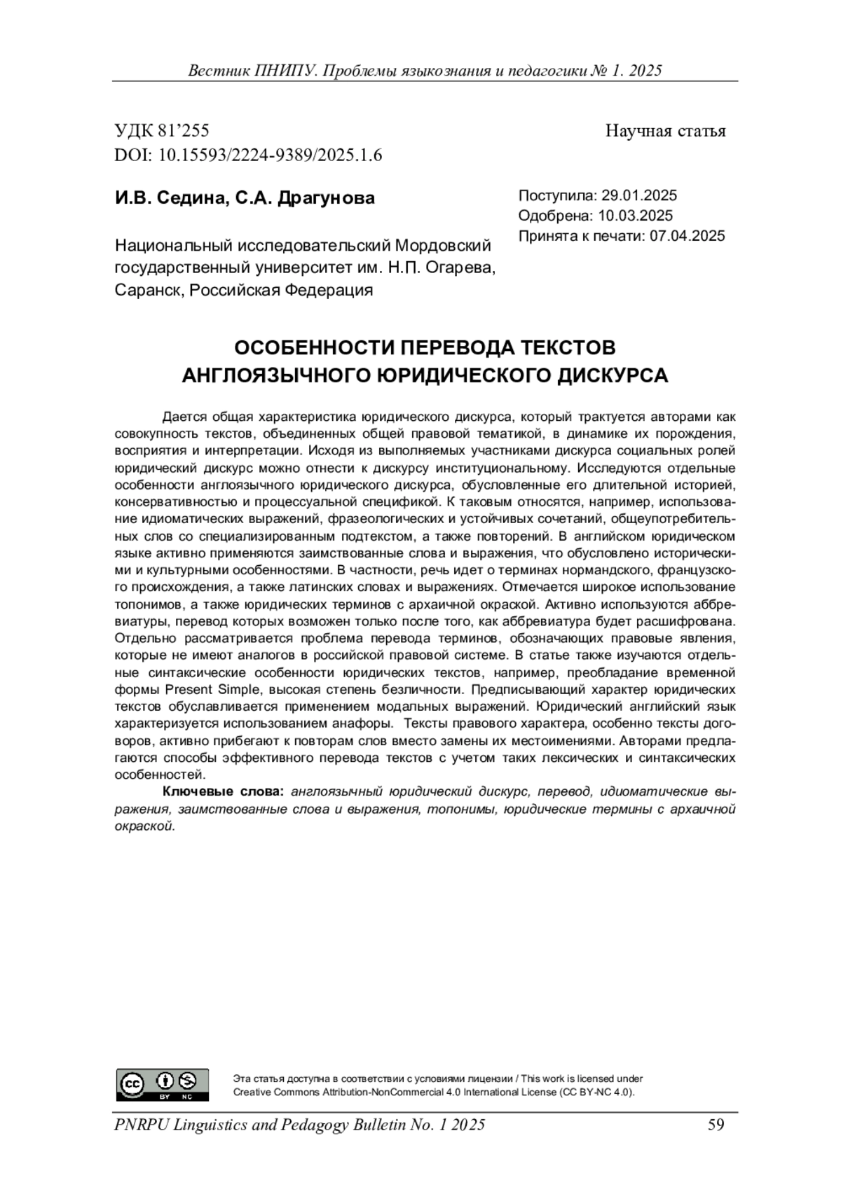 СЕДИНА И. В., СЕДАШКИНА С. А. ОСОБЕННОСТИ ПЕРЕВОДА ТЕКСТОВ АНГЛОЯЗЫЧНОГО ЮРИДИЧЕСКОГО ДИСКУРСА // ВЕСТНИК ПЕРМСКОГО НАЦИОНАЛЬНОГО ИССЛЕДОВАТЕЛЬСКОГО ПОЛИТЕХНИЧЕСКОГО УНИВЕРСИТЕТА. ПРОБЛЕМЫ ЯЗЫКОЗНАНИЯ И ПЕДАГОГИКИ. 2025. № 1