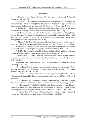 Дается общая характеристика юридического дискурса, который трактуется авторами как совокупность текстов, объединенных общей правовой тематикой, в динамике их порождения, восприятия и интерпретации. Исходя из выполняемых участниками дискурса социальных ролей юридический дискурс можно отнести к дискурсу институциональному. Исследуются отдельные особенности англоязычного юридического дискурса, обусловленные его длительной историей, консервативностью и процессуальной спецификой. К таковым относятся, например, использование идиоматических выражений, фразеологических и устойчивых сочетаний, общеупотребительных слов со специализированным подтекстом, а также повторений. В английском юридическом языке активно применяются заимствованные слова и выражения, что обусловлено историческими и культурными особенностями. В частности, речь идет о терминах нормандского, французского происхождения, а также латинских словах и выражениях. Отмечается широкое использование топонимов, а также юридических терминов с архаичной окраской. Активно используются аббревиатуры, перевод которых возможен только после того, как аббревиатура будет расшифрована. Отдельно рассматривается проблема перевода терминов, обозначающих правовые явления, которые не имеют аналогов в российской правовой системе. В статье также изучаются отдельные синтаксические особенности юридических текстов, например, преобладание временной формы Present Simple, высокая степень безличности. Предписывающий характер юридических текстов обуславливается применением модальных выражений. Юридический английский язык характеризуется использованием анафоры. Тексты правового характера, особенно тексты договоров, активно прибегают к повторам слов вместо замены их местоимениями. Авторами предлагаются способы эффективного перевода текстов с учетом таких лексических и синтаксических особенностей