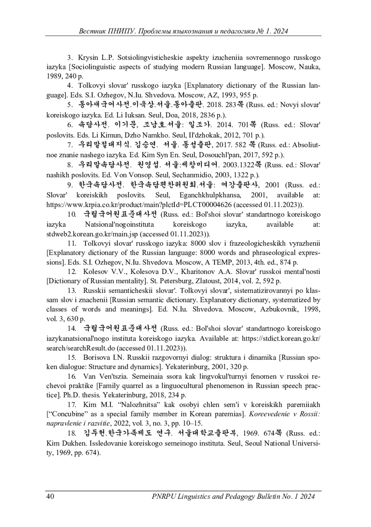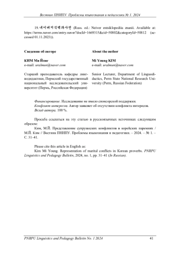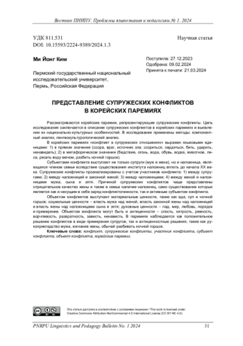 КИМ М. Й. ПРЕДСТАВЛЕНИЕ СУПРУЖЕСКИХ КОНФЛИКТОВ В КОРЕЙСКИХ ПАРЕМИЯХ // ВЕСТНИК ПЕРМСКОГО НАЦИОНАЛЬНОГО ИССЛЕДОВАТЕЛЬСКОГО ПОЛИТЕХНИЧЕСКОГО УНИВЕРСИТЕТА. ПРОБЛЕМЫ ЯЗЫКОЗНАНИЯ И ПЕДАГОГИКИ. 2024. № 1