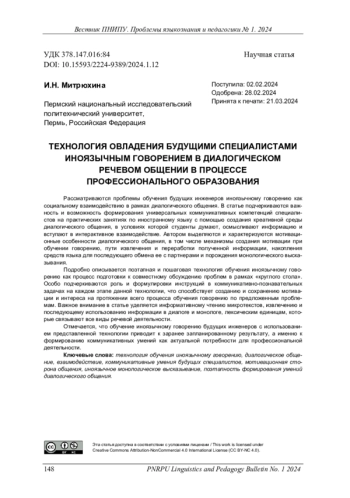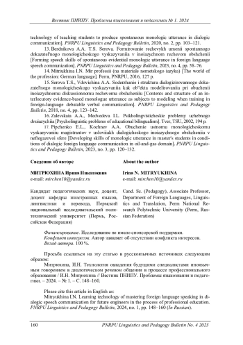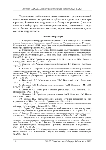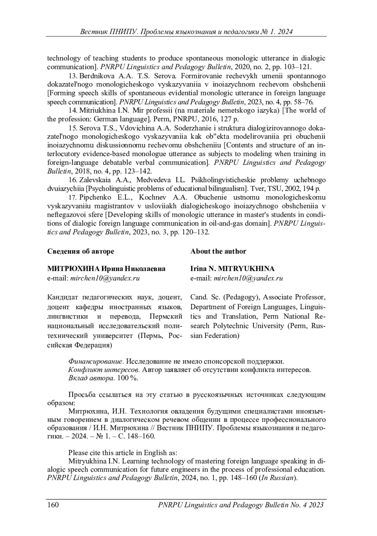 13. Бердникова, А.А. Формирование речевых умений спонтанного доказательного монологического высказывания в иноязычном речевом общении / А.А. Бердникова, Т.С. Серова // Вестник Пермского национального исследовательского политехнического университета. Проблемы языкознания и педагогики. - 2023. - № 4. - С. 58-76. EDN: AGVLLO