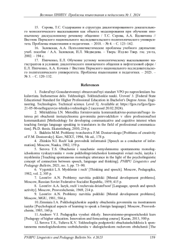 17. Пипченко, Е.Л. Обучение устному монологическому высказыванию магистрантов в условиях диалогического иноязычного общения в нефтегазовой сфере / Е.Л. Пипченко, А.А. Кочнев // Вестник Пермского национального исследовательского политехнического университета. Проблемы языкознания и педагогики. - 2023. - № 3. - С. 120-132. EDN: COAKHO