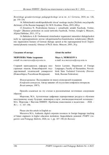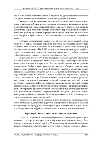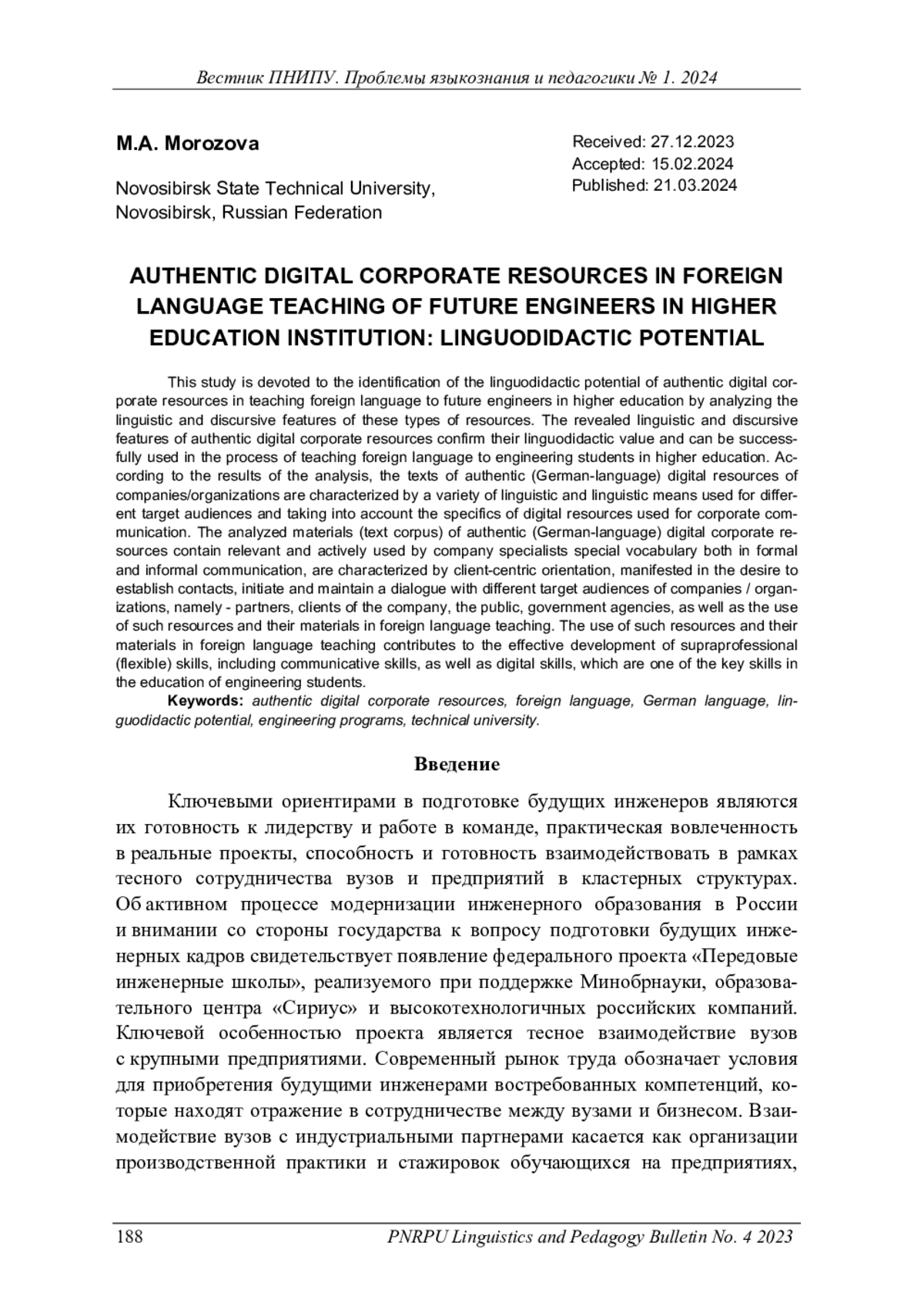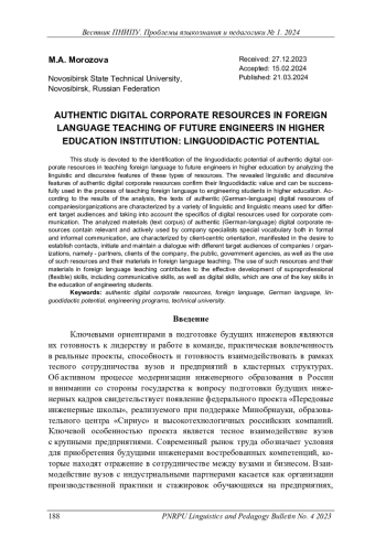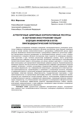 МОРОЗОВА М. А. АУТЕНТИЧНЫЕ ЦИФРОВЫЕ КОРПОРАТИВНЫЕ РЕСУРСЫ В ОБУЧЕНИИ ИНОСТРАННОМУ ЯЗЫКУ БУДУЩИХ ИНЖЕНЕРОВ В ВУЗЕ: ЛИНГВОДИДАКТИЧЕСКИЙ ПОТЕНЦИАЛ // ВЕСТНИК ПЕРМСКОГО НАЦИОНАЛЬНОГО ИССЛЕДОВАТЕЛЬСКОГО ПОЛИТЕХНИЧЕСКОГО УНИВЕРСИТЕТА. ПРОБЛЕМЫ ЯЗЫКОЗНАНИЯ И ПЕДАГОГИКИ. 2024. № 1